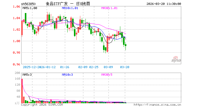 3月20日,截止午间收盘,食品ETF广发(563850)跌0.20%,报0.991元,成交额135.16万元。食品ETF广发(563850)重仓股方面,海天味业截止午盘跌0.44%,伊利股份涨0.91%,双汇发展涨0.39%,安琪酵母涨0.12%,中粮糖业涨3.86%,金龙鱼涨0.00%,安井食品跌1.27%,新诺威跌1.71%,汤臣倍健跌0.09%,中炬高新涨0.54%。