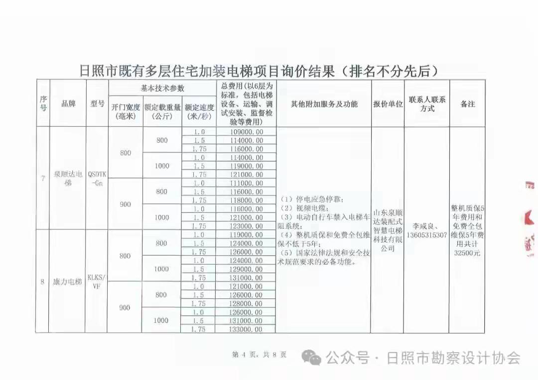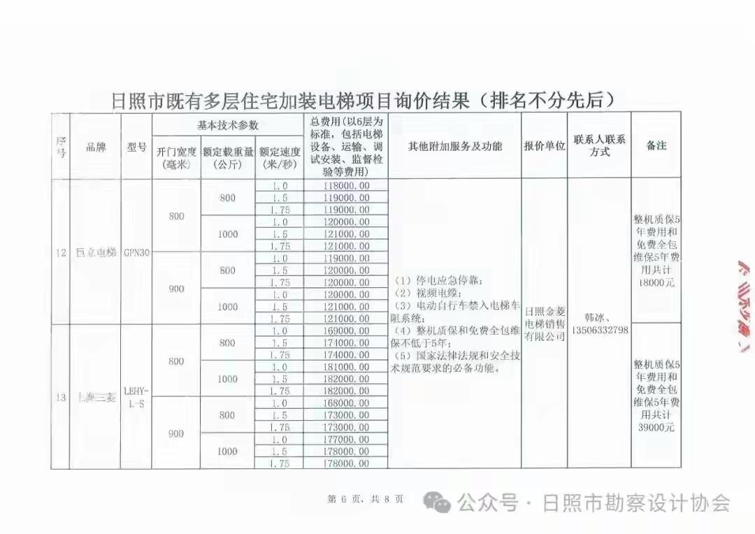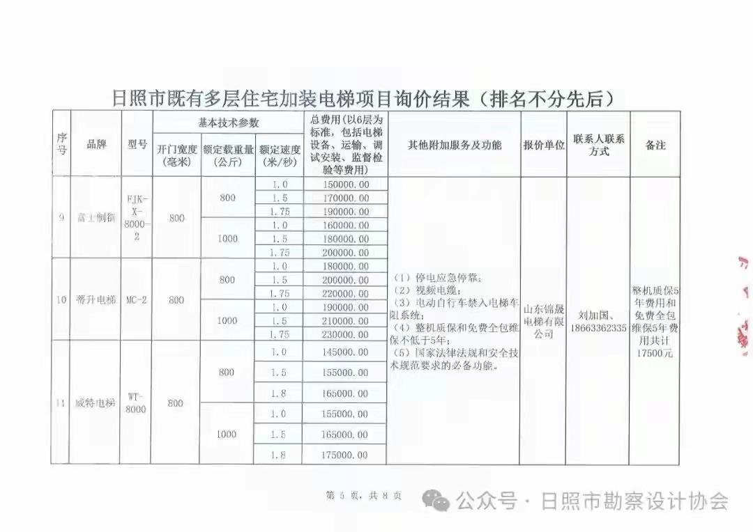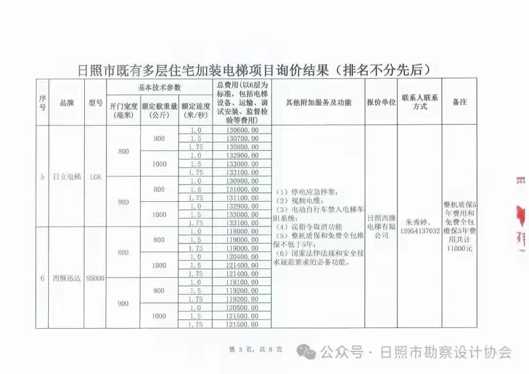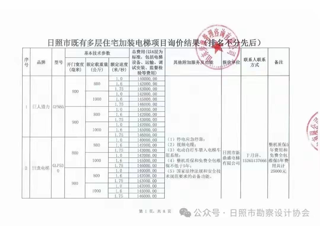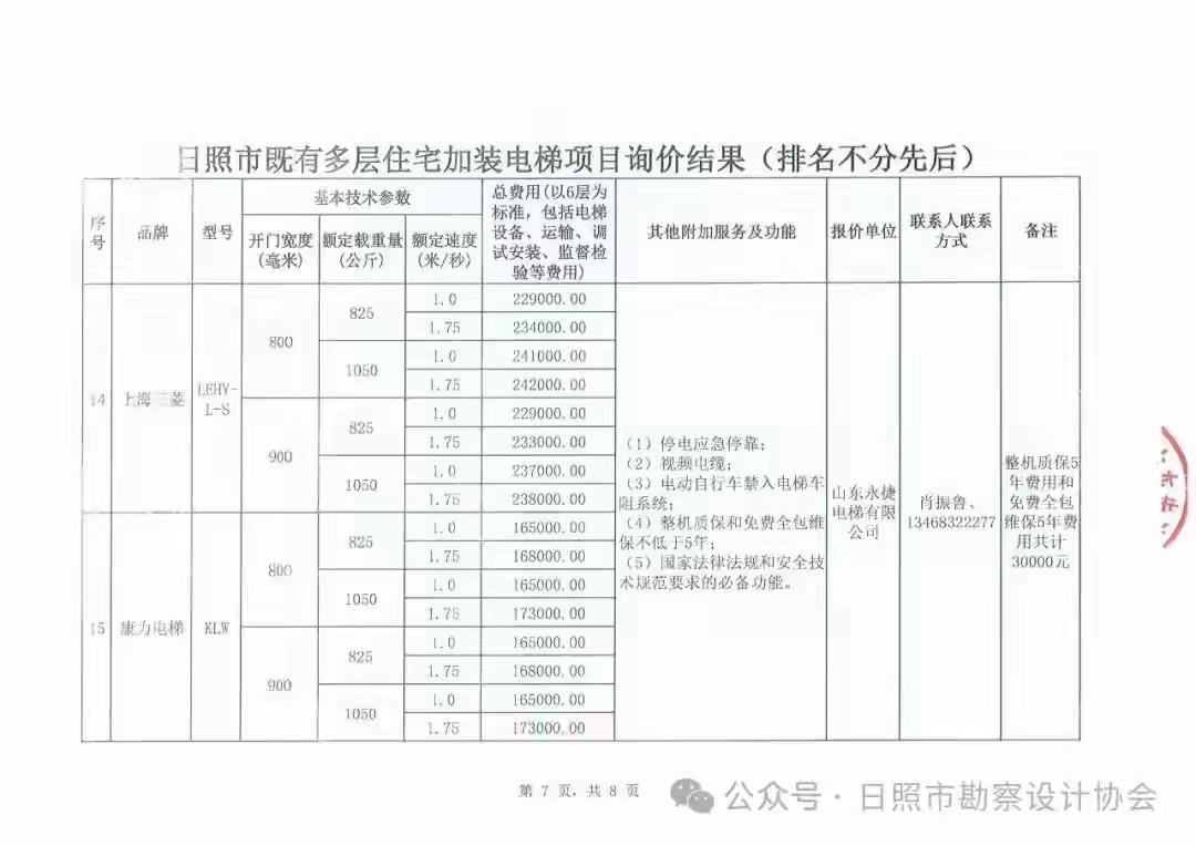 山东省日照市既有多层住宅加装电梯设备公开询价结果公告,大家可参照