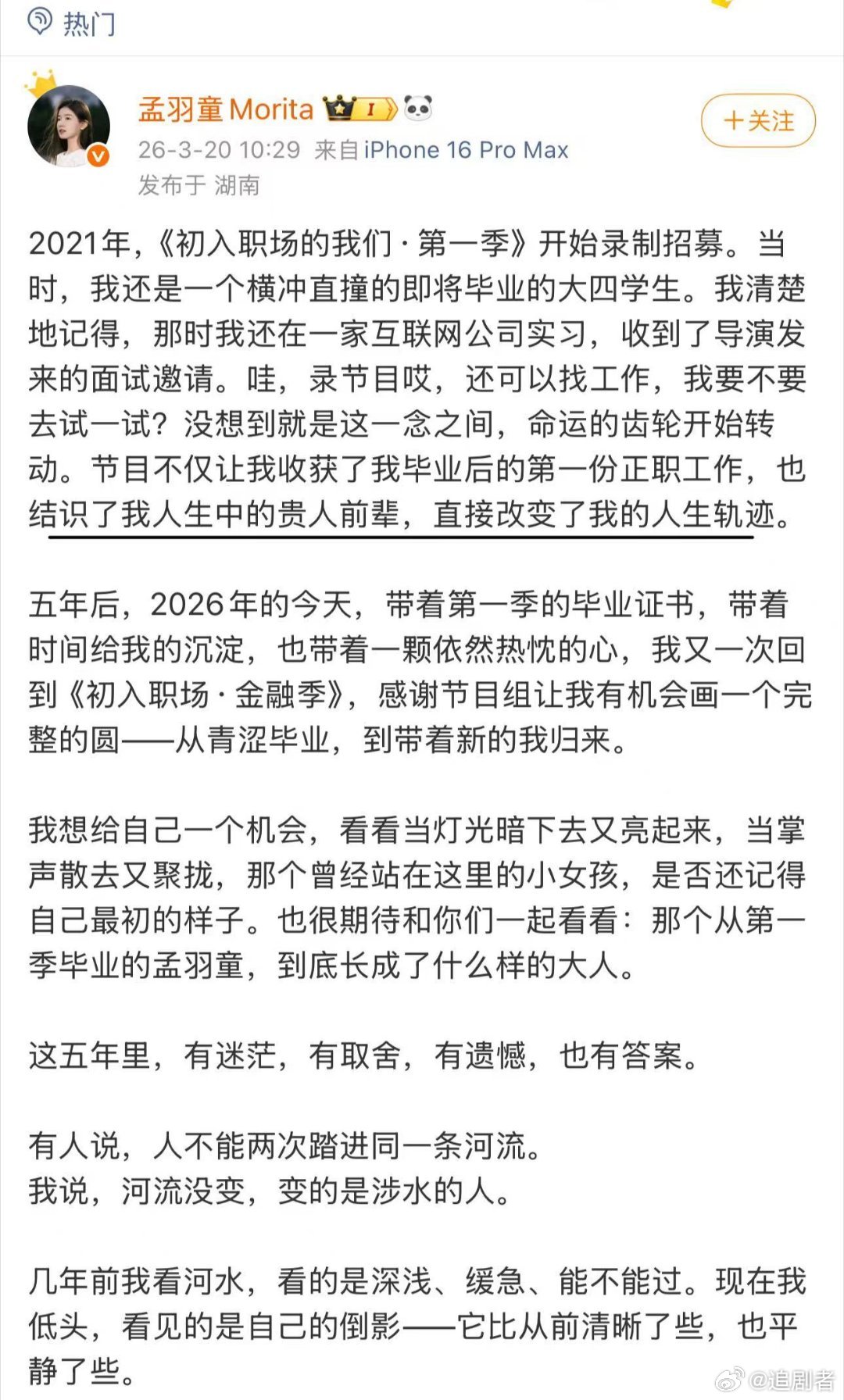孟羽童发文说董明珠是贵人孟羽童发文说初入职场改变了人生 孟羽童直言综艺改变人生,感恩董明珠提携,时隔五年回归,依旧心怀热忱。