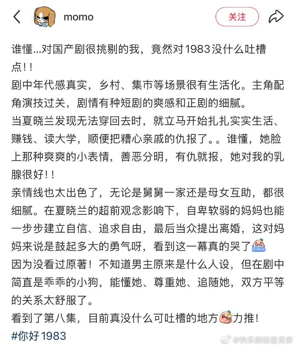 你好1983口碑发酵 酒香不怕巷子深,这部剧正靠口碑慢慢出圈!流量演员搭配实力班底,一时数据不算什么,好口碑才是剧集长久的底气~你好1983