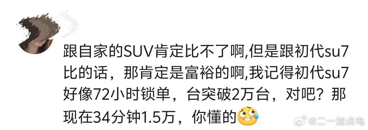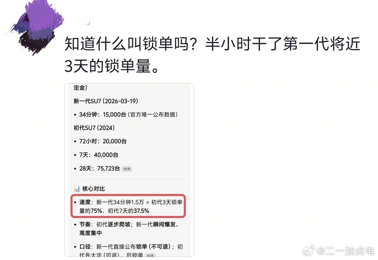 昨天发个视频说新su7订单不及预期,结果🐒跑过来的话术就是,初代72小时锁单才2万,新一代半小时锁单就1万5了。