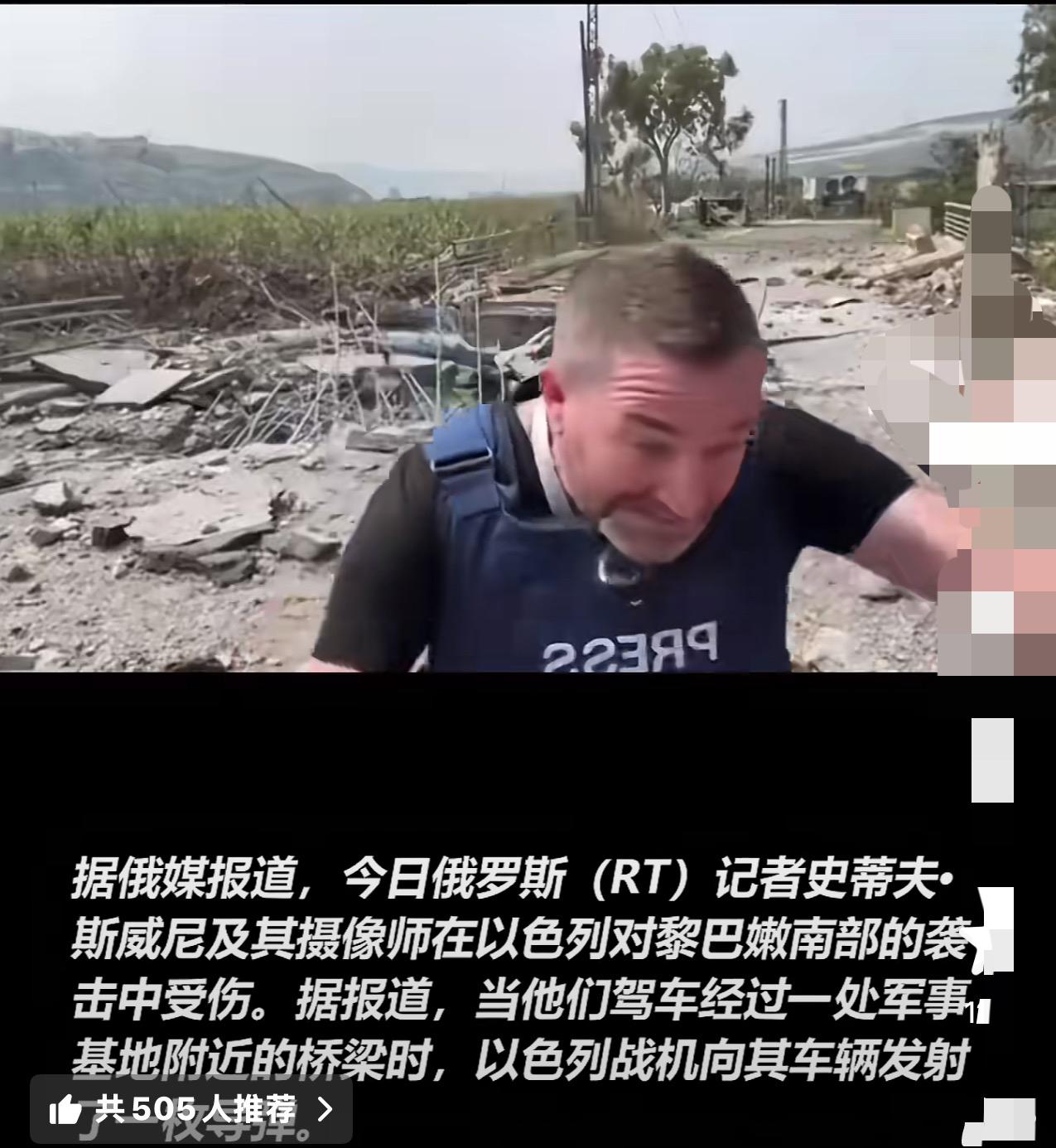 以色列袭击俄罗斯驻黎巴嫩记者 3月19日,俄罗斯外交部就以色列在黎巴嫩袭击俄罗斯电视台记者一事发表声明称,此次袭击严重违反国际法,俄方坚持要求对该事件进行彻查并严惩肇事者。俄外交部将于近期召见以色列驻俄罗斯大使。 近日,今日俄罗斯(RT)记者史狄蒂夫•斯维尼与摄像师阿里•里达在黎巴内南部报道以色列空袭时遭到以色列战机的导弹袭击,两人被弹片击伤,目前两人均意识清醒,还在医院抢救。 根据国际公约,记者是受保护的特殊群体,任何交战一方都不得对记者实施伤害。以色列对黎巴嫩的袭击,毫无理由,毫无底线,受到国际社会的一致谴责。以色列之所以敢于袭击俄罗斯媒体记者,就是在对所有记者发出警告,不要报道以色列袭击黎巴嫩的真实战况,不要让以色列的暴行暴露于天下。