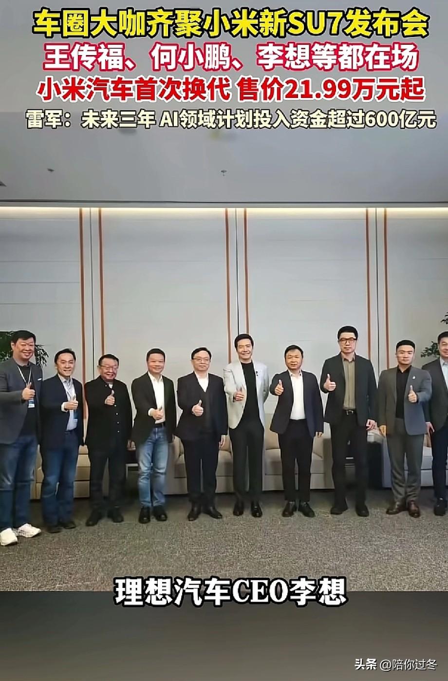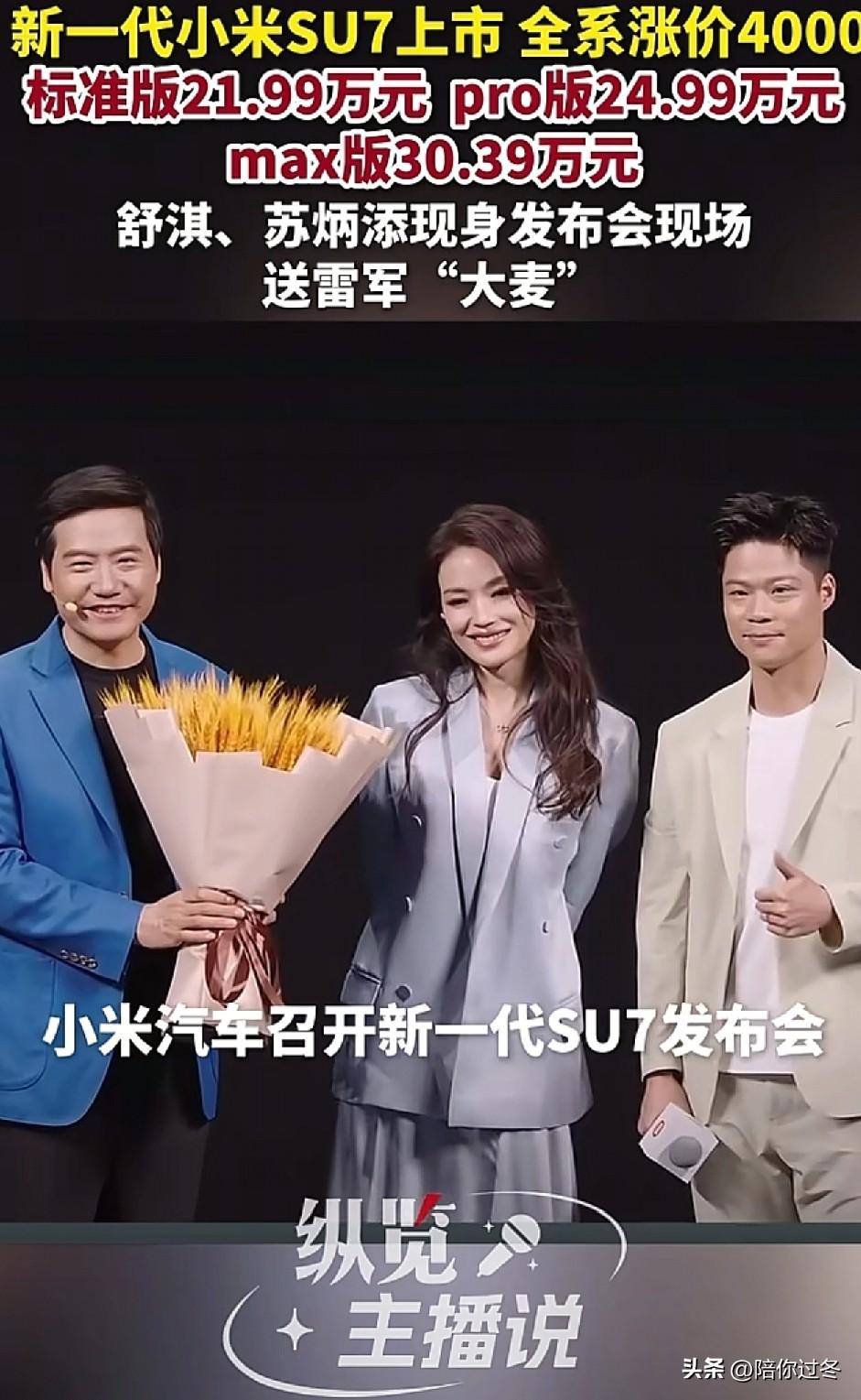 舒淇代言!新一代小米SU7上市! 王传福,李想,何小鹏,王兴兴等一众大咖为雷军小米助阵,排面拉满,雷军不愧为“营销大师”这一波热度势不可挡,请来这么多大咖,可见雷总的人脉真不简单! 3月19日晚,新一代小米SU7发布会正式开拉开帷幕,新款小米SU7起步价为21.99万起,比老款仅贵了4000元,但是配置却升级了不少,性价比还是非常高的。 除了全新SU7给粉丝带来的惊喜之外,而雷军请来的助阵嘉宾更让人震撼不已。 比亚迪王传福、理想汽车李想、小鹏汽车何小鹏、北汽张建勇、阿维塔王辉,等悉数到场,这应该是汽车圈最具有代表性的人物了吧! 除了车圈的大佬,宇树科技创始人王兴兴、凡客诚品创始人陈年,也都来到了现场为小米站台,可见雷总的人脉真的是不一般呀! 此外,雷军应粉丝要求还请来了大明星舒淇和苏炳添,为小米SU7代言,舒淇现场还送了雷总一束“大麦”鲜花,寓意着小米汽车大卖! 大家觉得小米SU7怎么样,你们会选择吗?小米su7 小米YU7雷军