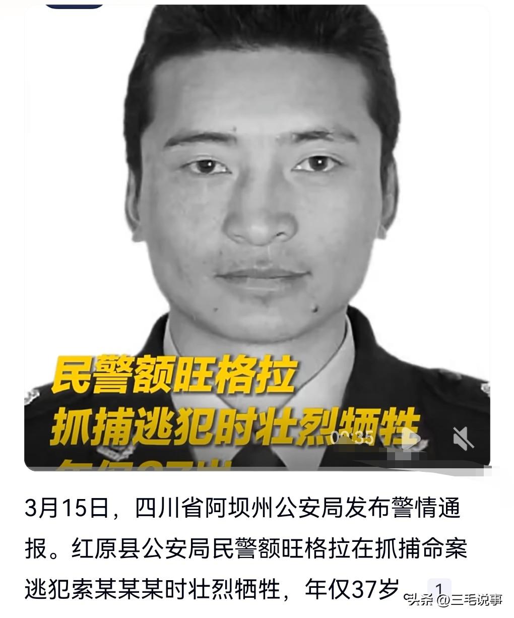 这真的是太悲剧了,近日,红原县公安民警额旺格拉,在抓捕逃犯时壮烈牺牲。 他当时冲在最前面,没想到嫌疑人手中竟然有枪,朝他开枪了,随后倒地不起。 最终壮烈牺牲。 这真的是太悲剧了。 等待犯罪分子的必将是法律的严惩。 才37岁就献出了自己宝贵的生命,真的是让人痛心。 警察这个职业真的是很伟大。 建议每次出任务时最好是做好保护措施。