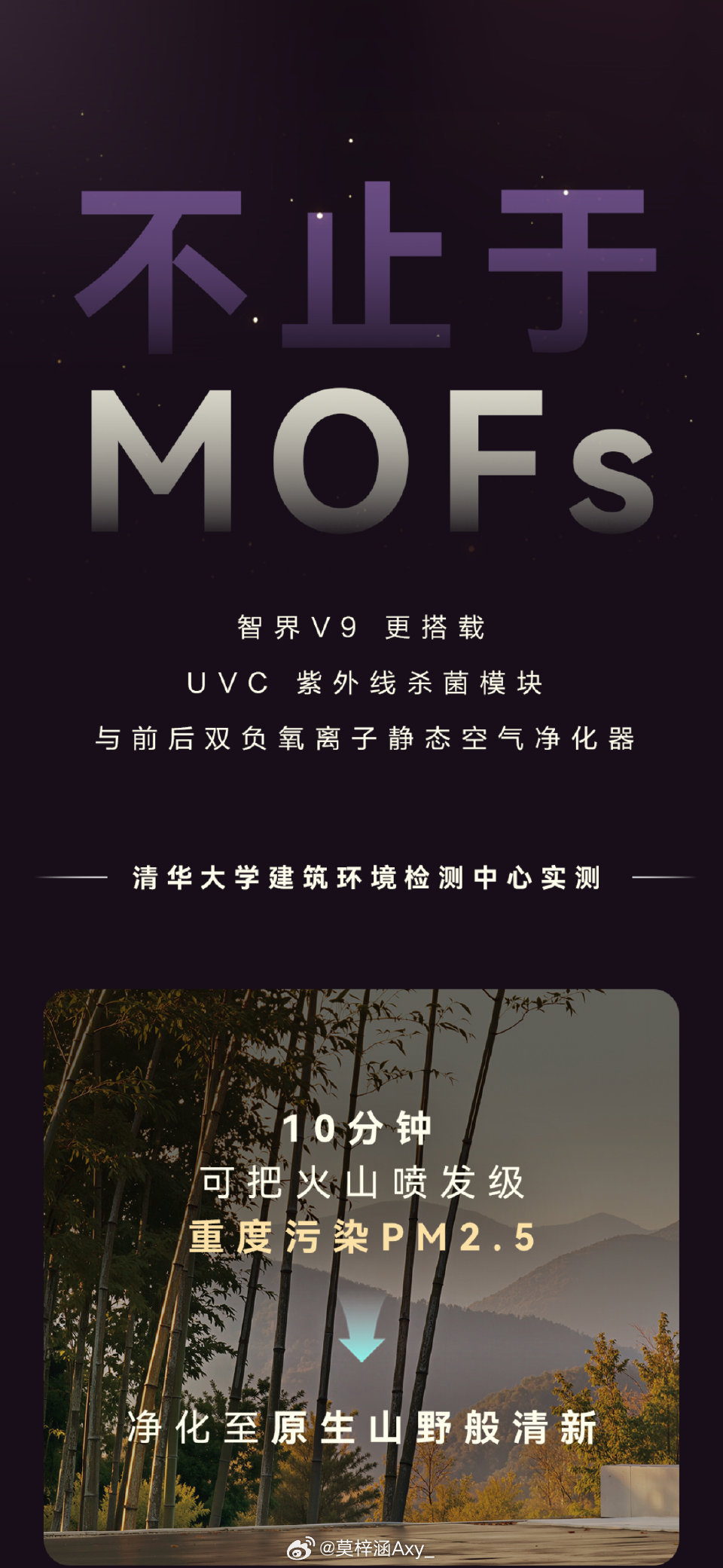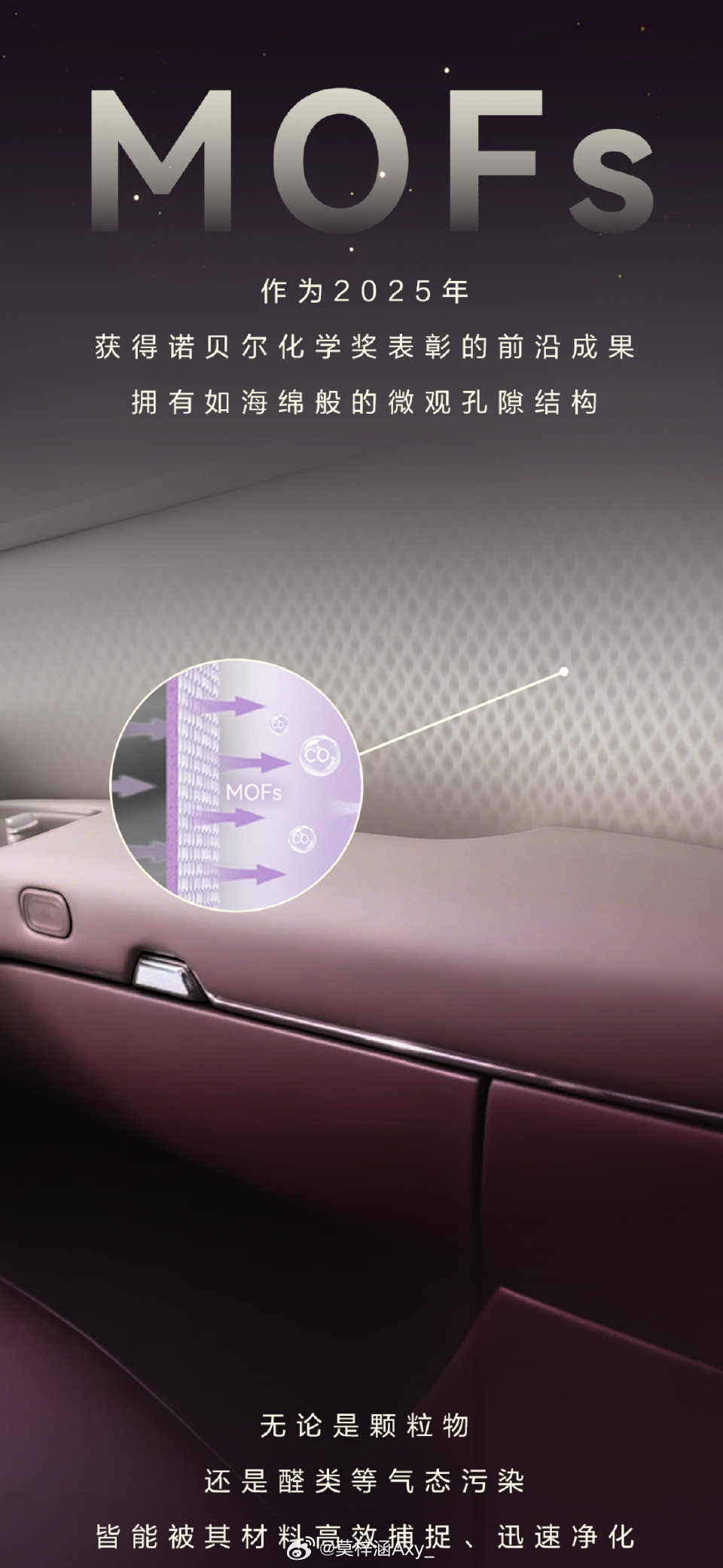 智界V9诺贝尔奖材料MOFs上车智界V9鸿蒙采用ALPS健康座舱,率先将诺贝尔化学奖材料MOFs应用于座舱内,不仅配备UVC+MOFs抗菌滤芯,更在全车顶棚、地板、门板、行李箱地毯等部位均增加MOFs吸附降解内饰,其内部丰富的孔洞结构可以吸附PM2.5、五苯三醛、二氧化氮等有害物,同时将醛类物质降解为无害的水和二氧化碳,实现持续净化,智界V9通过MOFs材料革新了传统座舱净化逻辑,从被动过滤升级为主动降解,成为50万级豪华MPV市场中“健康科技”标杆。大v聊车汽场全开