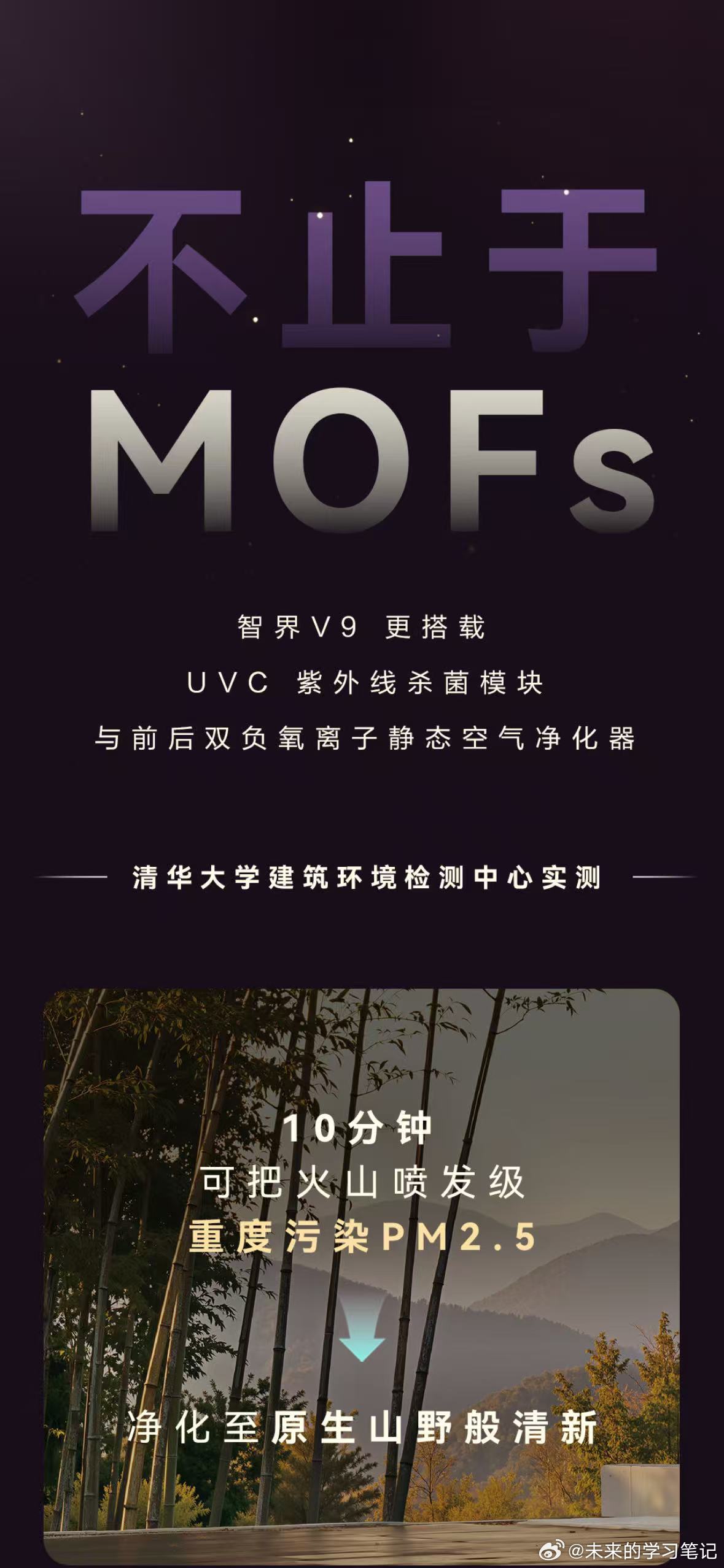 智界V9诺贝尔奖材料MOFs上车 3月MOFs材料技术正是2025年诺贝尔化学奖所表彰的前沿成果,该材料凭借超强物理吸附与化学降解双重特性,可对PM2.5、甲醛等多种污染物实现高效净化。