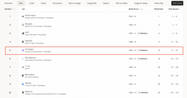 图说:凭借Qwen3.5-Max-Preview,阿里跻身全球前五大模型公司