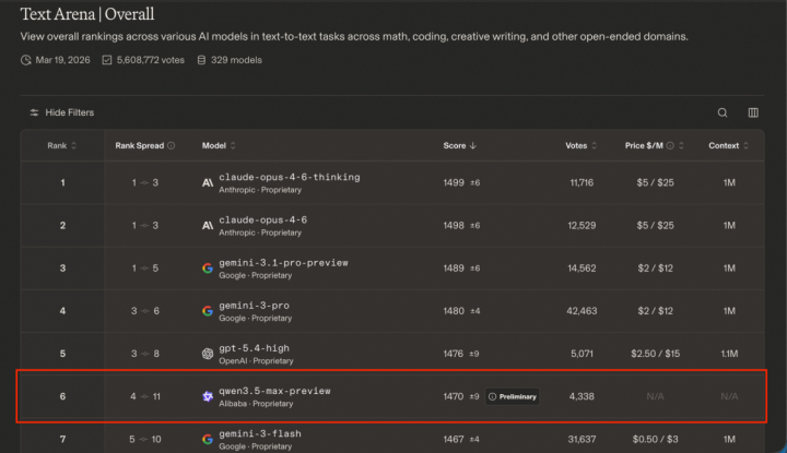 3月20日,全球知名的大模型盲测榜单LMArena更新了新一期排名,阿里巴巴千问最新旗舰模型预览版Qwen3.5-Max-Preview首度亮相,斩获1464分,超过了GPT5.4、Claude4.5、Grok4.1等海外顶级模型,以及豆包2.0、GLM5、Kimi2.5等全部国产模型,千问问鼎中国最强大模型。同时,在LMArena基于模型能力对全球大模型公司排名的榜单中,5家中国公司闯进前十,阿里位列全球前五、中国第一,字节、智谱、月之暗面、百度等闯入全球前十。