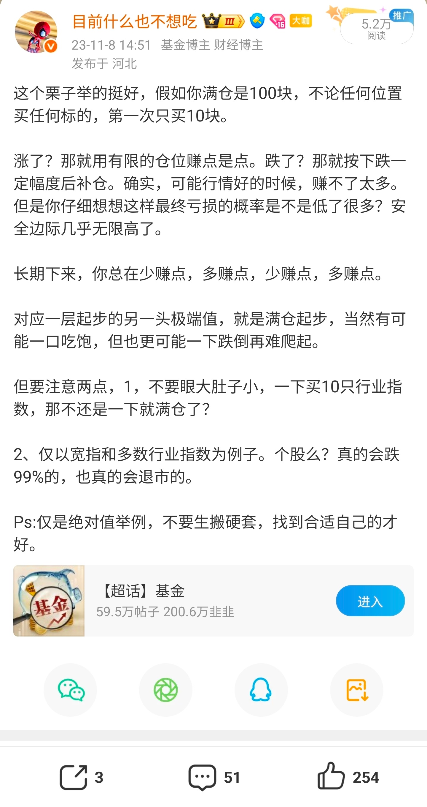 每轮行情,最高潮时大家比的都是仓位,十万羡慕百万,百万羡慕千万。但每轮行情比到最后,比的还是成本,不经历一轮完整牛熊的人是不会懂得。