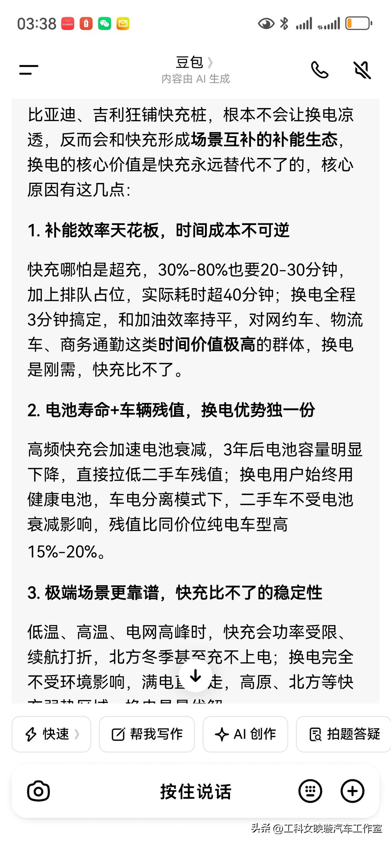 我问AI:比亚迪和吉利都搞兆瓦闪充,蔚来的换电是不是凉啦,它给我一堆理由.......我觉得它说的都不对。 因为比亚迪的储能本身,它可以去吸储太阳能啊,或者是电网低价的时候,把电存储起来,等那个白天需要的时候再放出来,它本身也是一个换电啊,它本身也是一个换电的底层商业生意啊, 这叫“储能快充式换电”。 说白了:车企铺快充+储能,是“换电思维的普及”,反而会带火实体换电。 因为,都是换电,实体换电(换电池包),是极致升级版,快充+储能是低配版,根本替代不了。 储能柜是“换能量”,但电池包是“可移动的储能单元”,这是储能柜做不到的,也是换电的核心不可替代性。 我说的对吗?