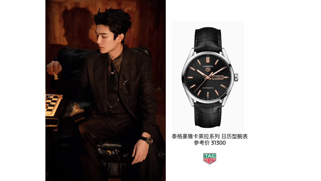 演员佩戴TAG Heuer泰格豪雅卡莱拉系列日历型腕表,在光影流转中定格其优雅而不失力量感的从容气度,尽显当代精英的儒雅型格与锐意锋芒。
