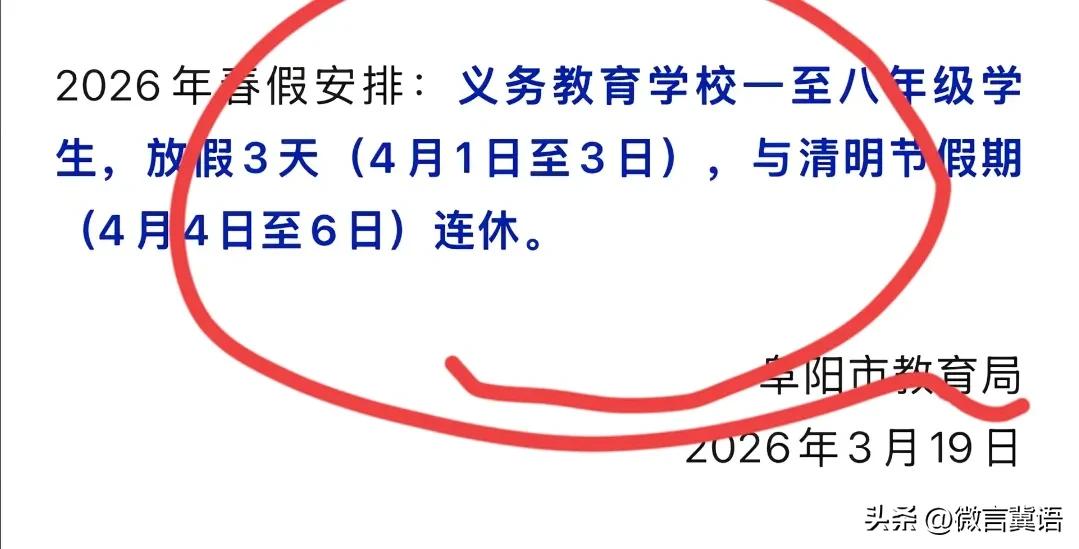 【春假6天!定了!】声明,不是石家庄!2026年3月19日,安徽省阜阳市的教育部门,发布了春假放假安排!还有四川德阳!一共是6天!这是先进的表现还是顺应潮流?还是咱们石家庄能顾全大局! 不过,石家庄好多家长,还是不希望放春假!这应该是初二,初三家长的心声吧!而且放假时间,也不要太长!你想啊!石家庄有的学校初三的已经进行了“基模”,也有的叫“摸底”考试!下面不光初三报名工作还要耽误几天复习,马上就是全省统一的“一模”,紧接着还有“市二模”,中间“理化生实验”,以及“体育考试”!初二的“小中考”马上就要来了!也就是八年级地理,生物已经开始紧张的复习,6月23日下午马上就要来到了! 光想着放假,初二八年级能复习好吗?初三九年级能复习好吗?实现择校自由,还是遥不可及的梦呢? 更绝的是,四川德阳校长要求一点作业也不能给学生留!安徽的放假的对象是,义务教育阶段的一至八年级学生,一共放假6天!还得顾及初三中考! 这些放假的地方,都是遵循上一世纪的规律吧?放春假和原来“放麦假”,放秋假和“放收玉米假”是一个意思!这都是新的年代了,为什么还是放这些没用的假期呢? 学校放春假 信息图片来源网络侵权联删