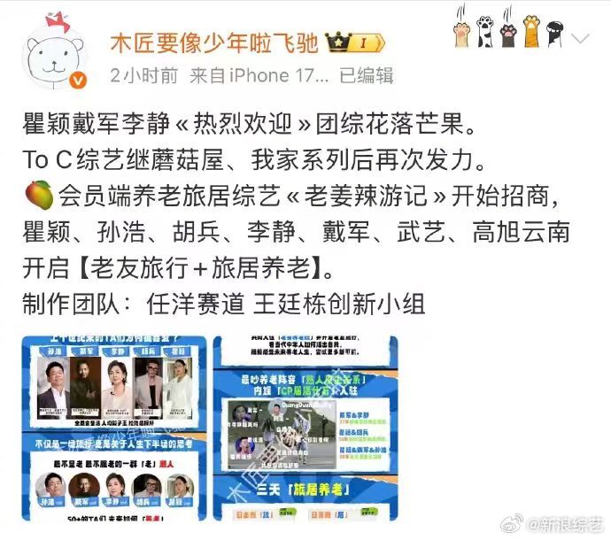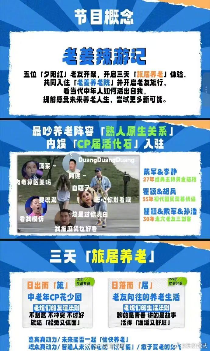 瞿颖胡兵李静戴军孙浩团综网传芒果要拍旅居养老真人秀《老姜辣游记》!瞿颖、胡兵、李静、戴军、孙浩五位相识超30年的老友合体,并携武艺、高旭在云南开启三天养老院旅居体验。由任洋赛道-王廷栋创新小组带队,开启聚焦50+人群如何活出自我,同时探讨未来养老模式。瞿颖近期凭真实松弛感翻红,金句频出;胡兵瞿颖35年神仙友谊再引关注。网友热议"90年代初代顶流老友局""光看他们唠嗑都能追一整季"。你期待吗?
