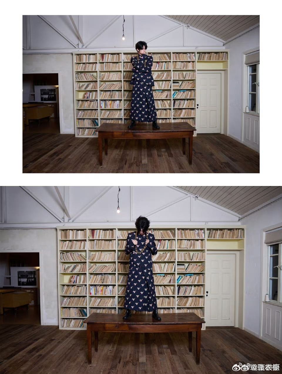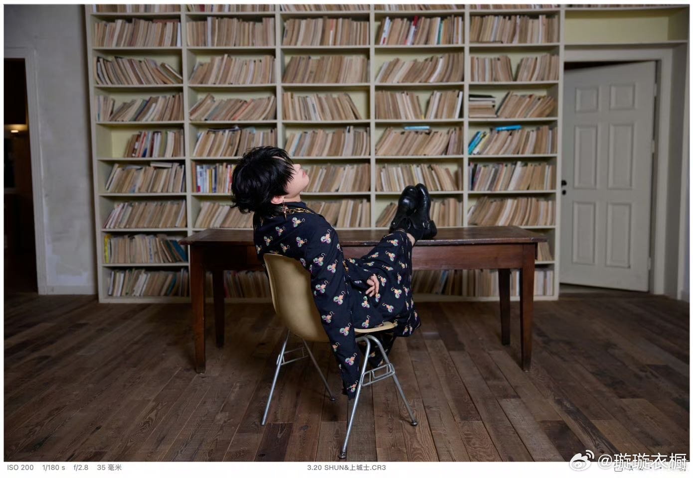 花衬衫在书墙前舒展,鎏金链是思想的锚点。影子与肢体共舞,定格成时光的诗行。张峻豪