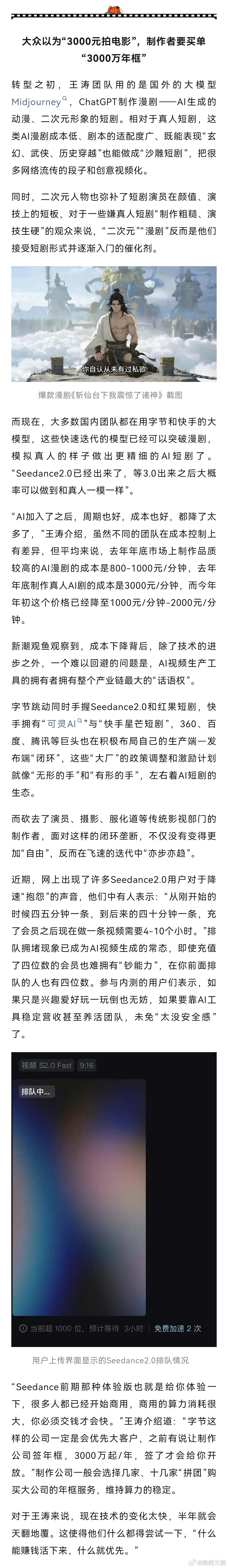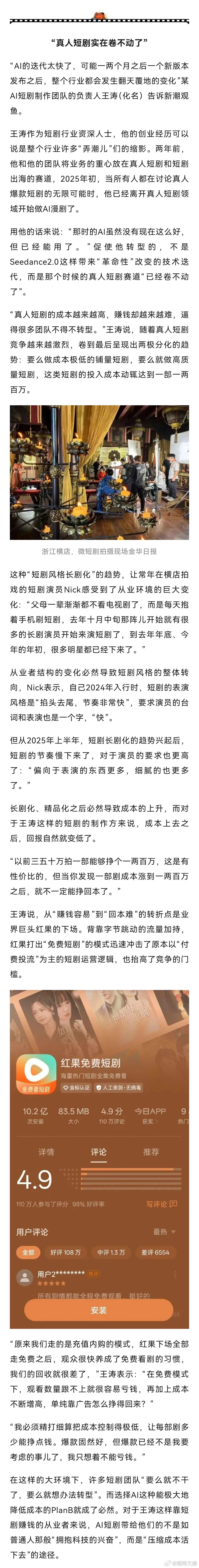 “AI的迭代太快了,可能一两个月之后一个新版本发布之后,整个行业都会发生翻天覆地的变化”某AI短剧制作团队的负责人王涛(化名)告诉新潮观鱼。王涛作为短剧行业资深人士,他的创业经历可以说是整个行业许多“弄潮儿”们的缩影。两年前,他和他的团队将业务的重心放在真人短剧和短剧出海的赛道,2025年初,当所有人都在讨论真人爆款短剧的无限可能时,他已经离开真人短剧领域开始做AI漫剧了。用他的话来说:“那时的AI虽然没有现在这么好,但已经能用了。”促使他转型的,不是Seedance2.0这样带来“革命性”改变的技术迭代,而是那个时候的真人短剧赛道“已经卷不动了”。