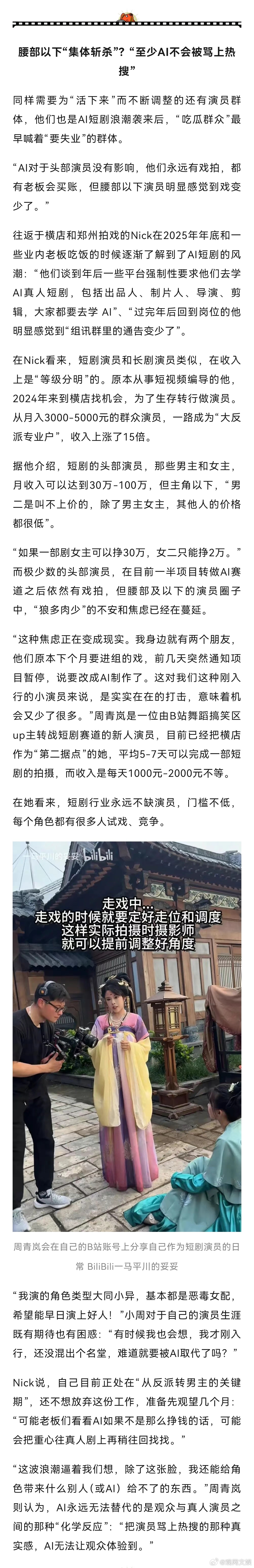 同样需要为“活下来”而不断调整的还有演员群体,他们也是AI短剧浪潮袭来后,“吃瓜群众”最早喊着“要失业”的群体。