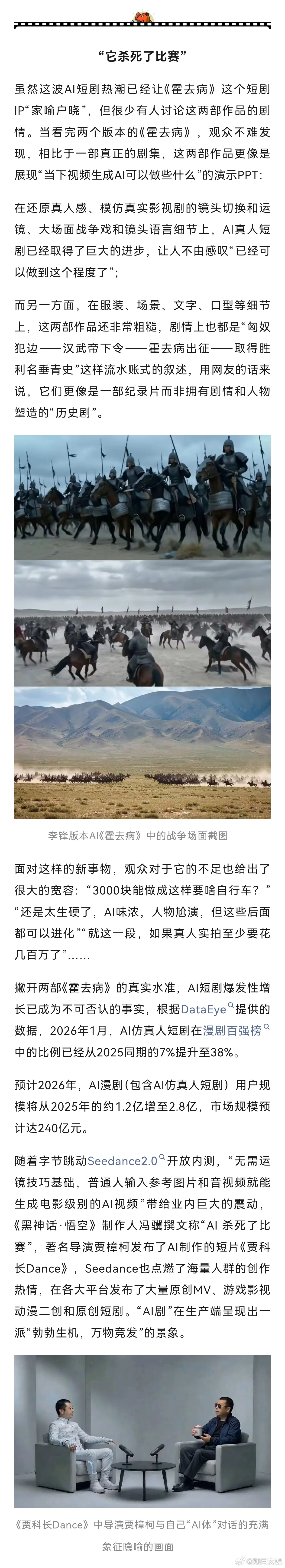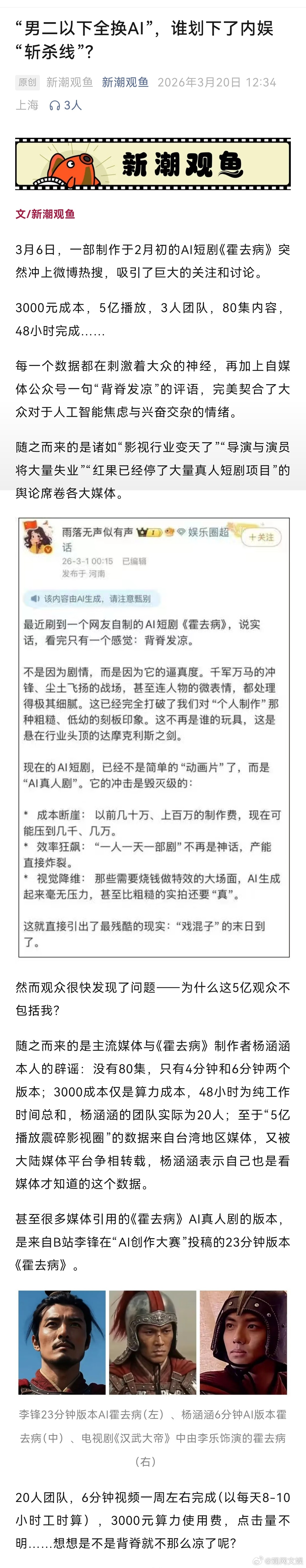 【演员将被AI“集体斩杀”?这不是行业的真问题】业内谈AI替代真人演员AI要划下内娱斩杀线了吗不到一个月的时间,从AI短剧《霍去病》引发关注,到“男二以下AI演员都不需要真人了”,再到AI数字艺人官宣签约,从热搜上就能窥出一波又一波的AI浪潮在冲击行业。