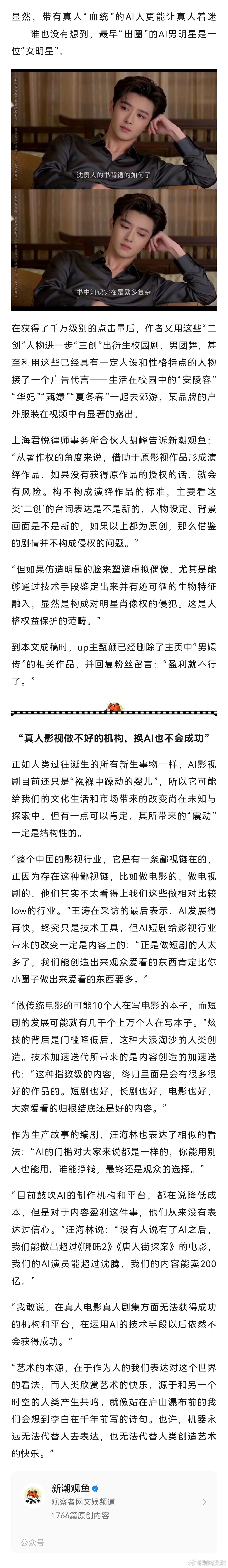 对于微博用户“开罗紫玫瑰大王”的那条热搜微博:“我还听到一个惊悚的消息,说以后男二以下的演员都不需要真人了,就用AI做。”