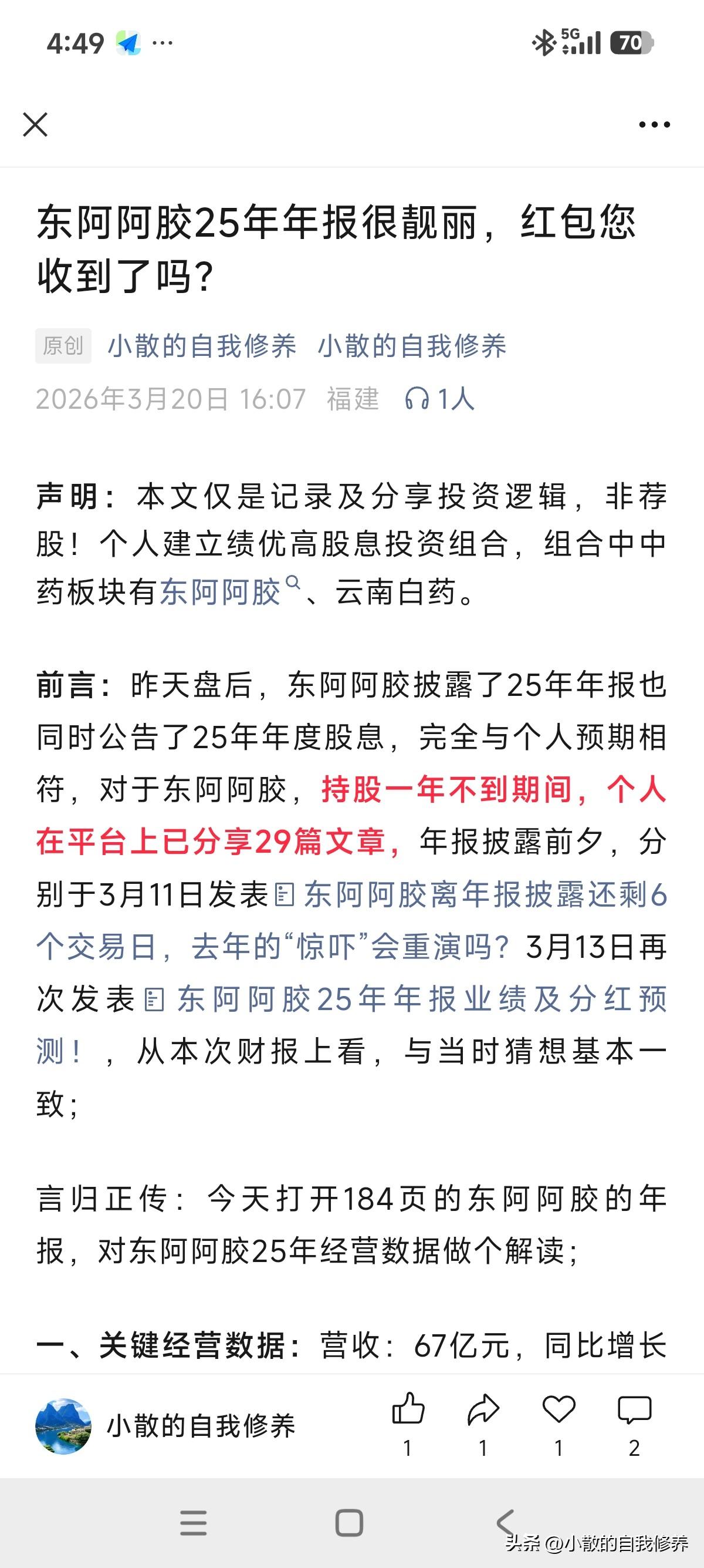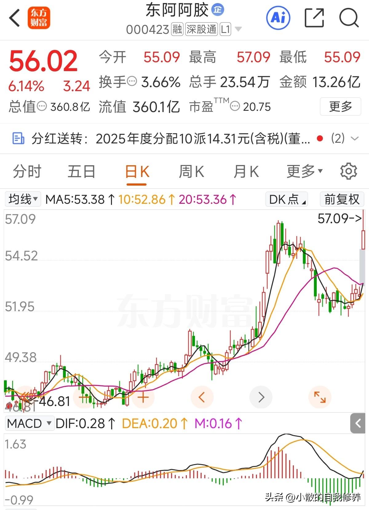 今天真给力,硬是靠着东阿把账户拉红了[呲牙],这就是组合的好处! 说起东阿阿胶,商业模式跟高端白酒类似,但是在股东回报方面比白水优秀太多了,连续多年坚持100%的股份支付率,同时还有回购注销[呲牙]! 另外还有个市值优势,目前360亿市值,账面无有息负债,类货币现金90多亿!妥妥的现金奶牛!