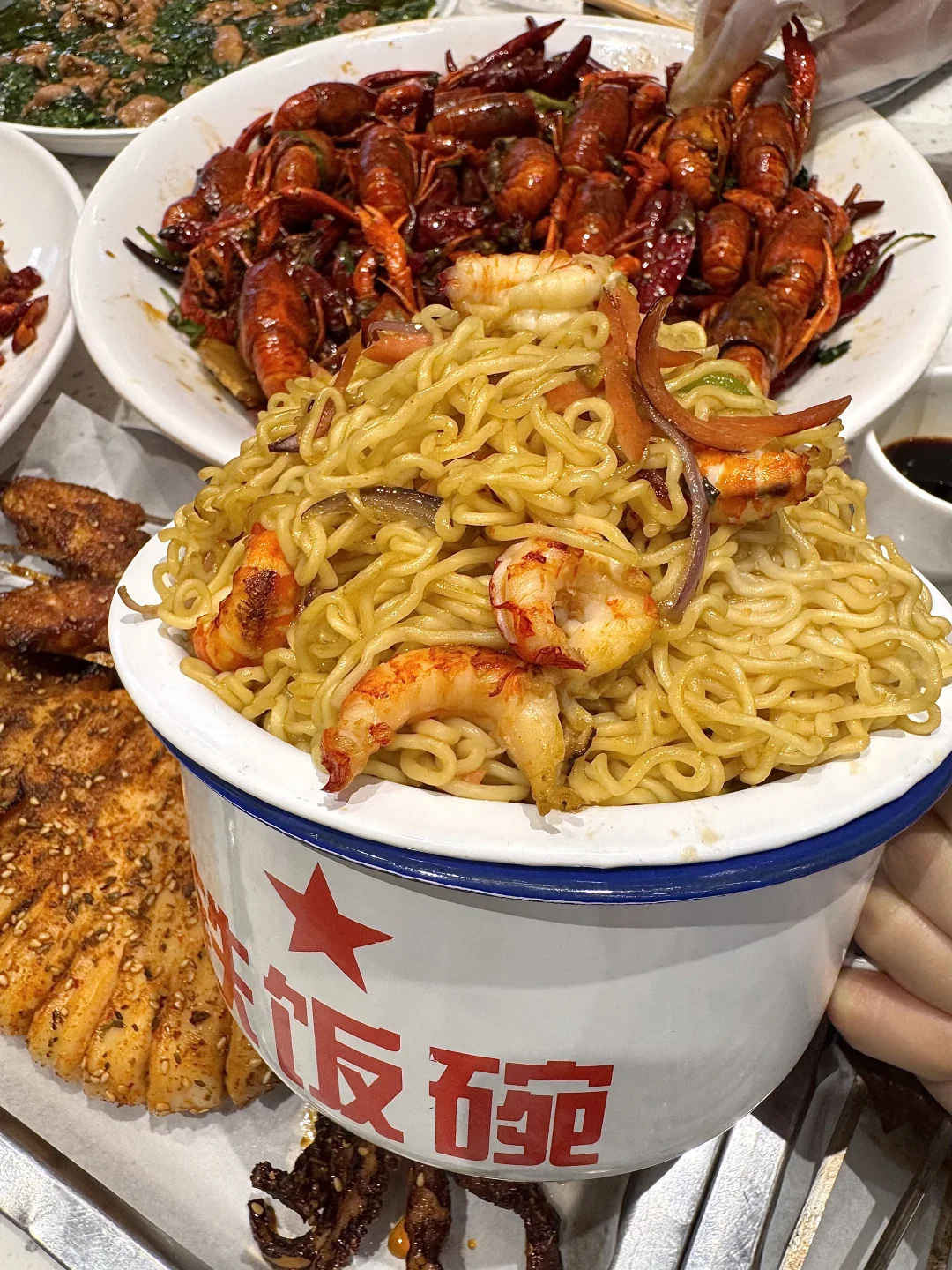 我心中杭州top级好吃的烧烤夜宵!都是附近居民来吃,价格实在口味地道!每一个来杭州的朋友都会被我带来这里! · ✔️布袋小龙虾 布袋饼炸过好有韧性!包着虾尾香香嫩嫩!沾点辣椒醋夯爆了! ✔️干煸辣子鸡 麻辣鲜香太过瘾啦!每一块都焦香入味~连鸡皮都很好吃! ✔️糖醋铁板烧 第一次吃!酸酸甜甜好香啊 泡面+里脊+火腿…一定要把流心蛋拌开口感更好! 📍刘栋梁大排档