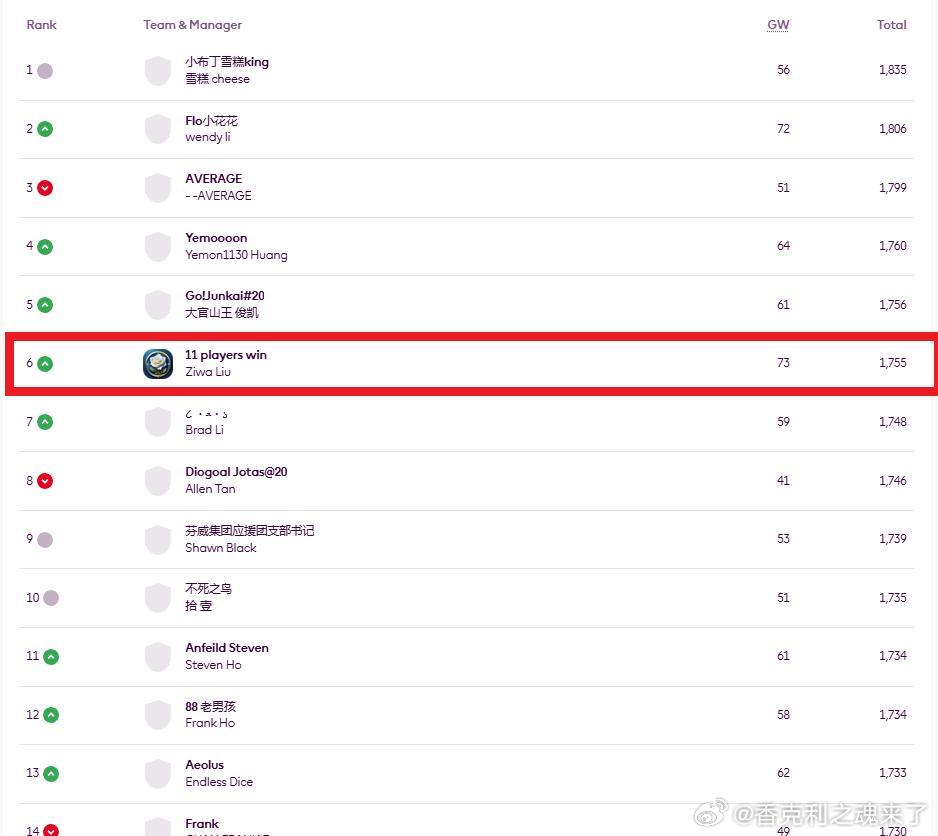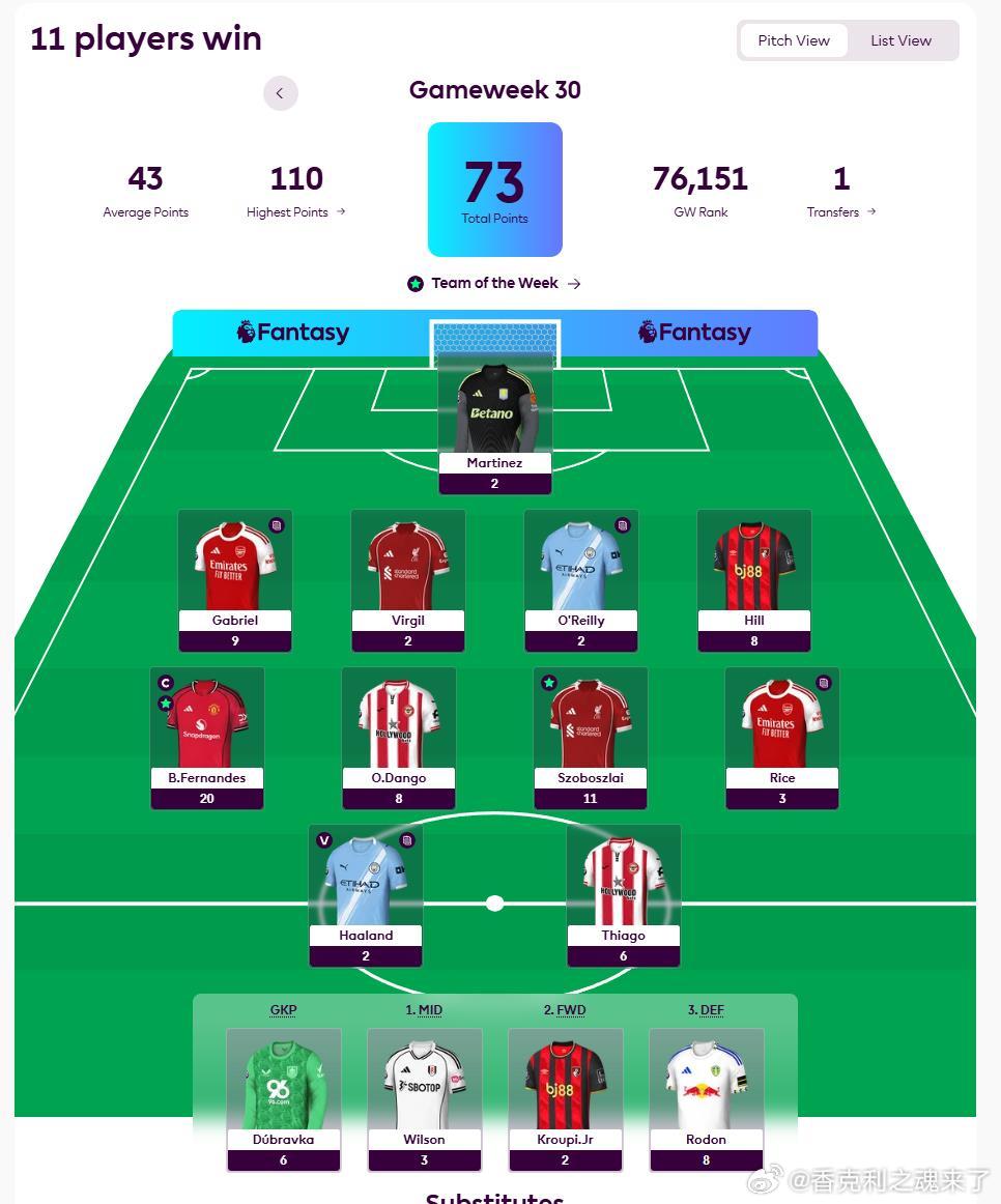 小香范特西联赛第30轮冠军获得者是11 players win ,拿到了本联赛的73分,本轮冠军是C了B费斩获了20分 恭喜这位经理,请私信联系我钥匙扣