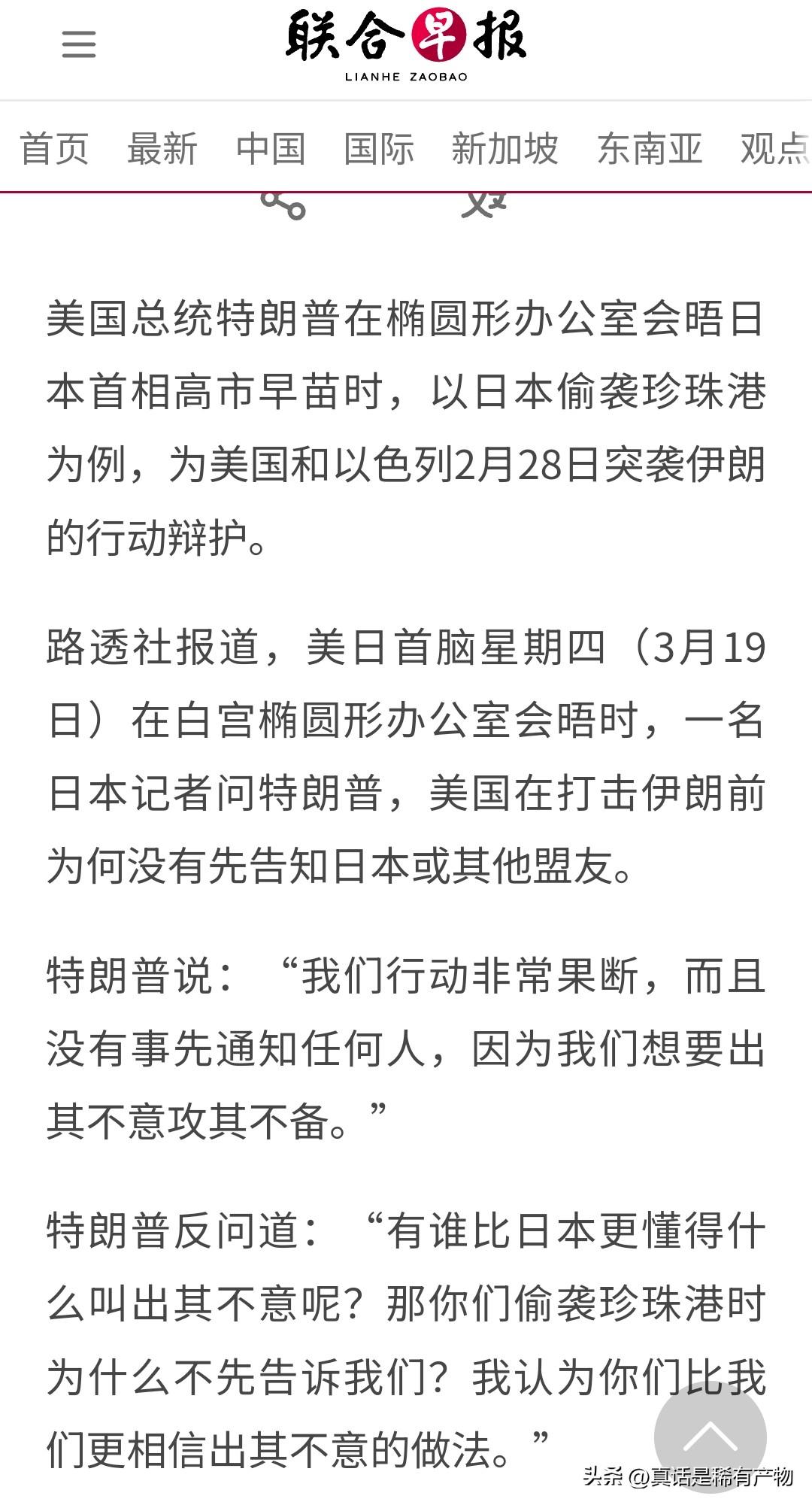 高市早苗吃瘪了,还是特朗普当着她的面给喂的。本来高市早苗跟个小迷妹一样和特朗普一块参加记者招待会,估计这个日本记者的提问也是高市提前知晓的。在日本记者问特朗普,美国和以色列联合攻击伊朗之前,你们是否通知了自己的盟友,包括日本?谁知道老头不按套路出牌直接指出:这事你们日本不是门清吗?你们当年攻击珍珠港的时候提前告诉过谁?这就是要出其不意,知道的人越少效果越好。一顿输出,让小迷妹瞬间懵逼。