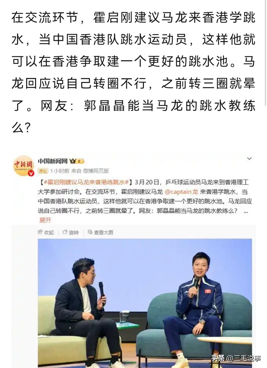哈哈,霍启刚真是个鬼才,他应该是开玩笑的吧。 3月20日,霍启刚建议马龙来香港学跳水,这样他就可以申请建一个好的跳水池了。 马龙直接婉拒了,说自己转三圈就晕了。 哈哈。 跳水那都是童子功啊,哪有半路出家的? 霍启刚很幽默。