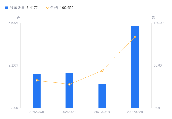日期A股户数(户)流通A股户均持股数(股)户均持股市值(万元)2026-02-283406413497.66135.852025-09-301488330893.26163.432025-06-301841624939.5183.422025-03-311814825206.1498.902024-12-311960223336.4495.492024-09-301217537572.16136.682024-06-30789757863.96298.862024-03-31886648202.41186.152024-02-29608131579.43119.402023-12-31535235880.88125.15