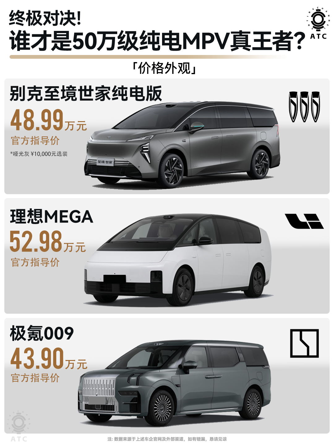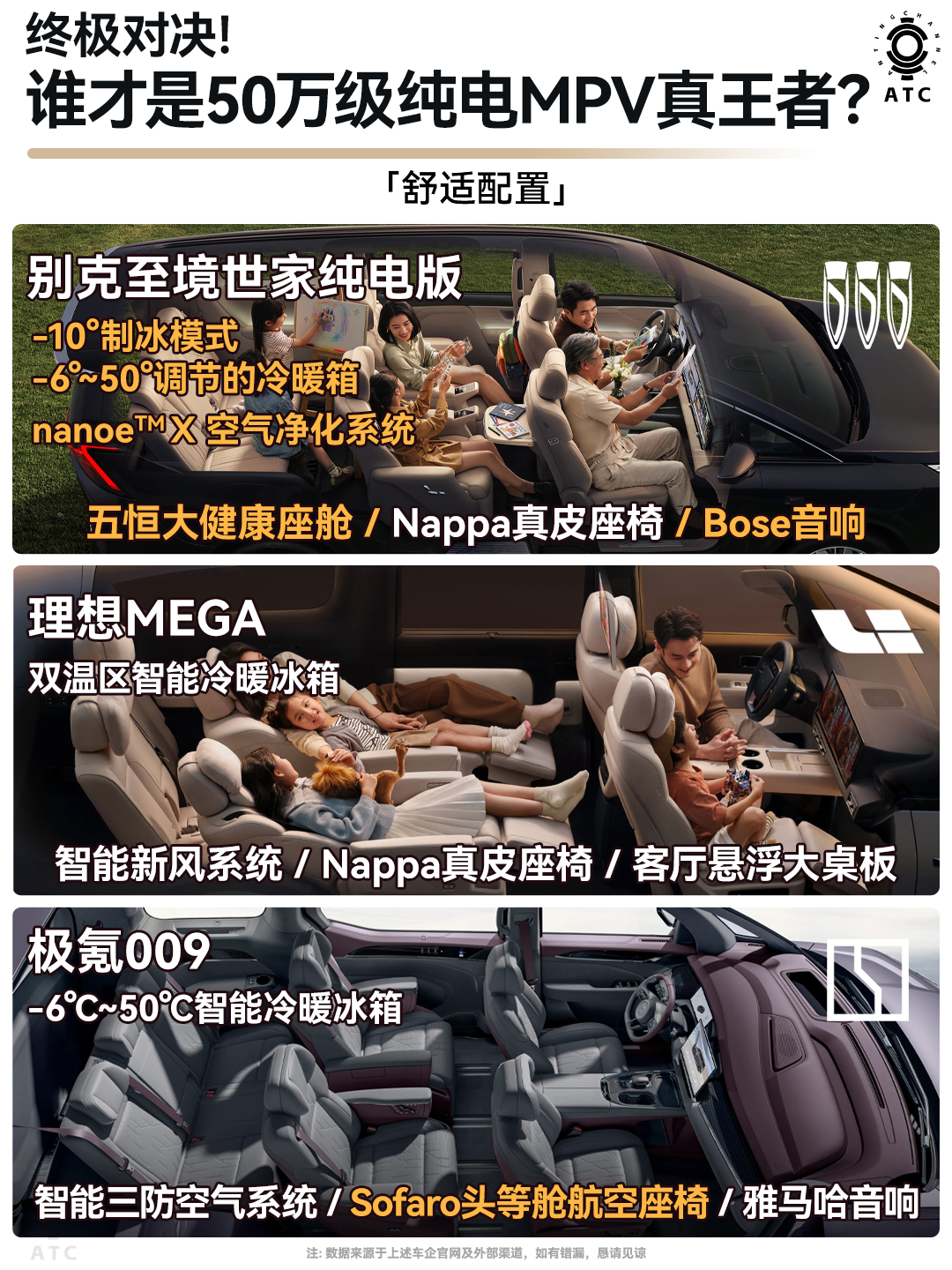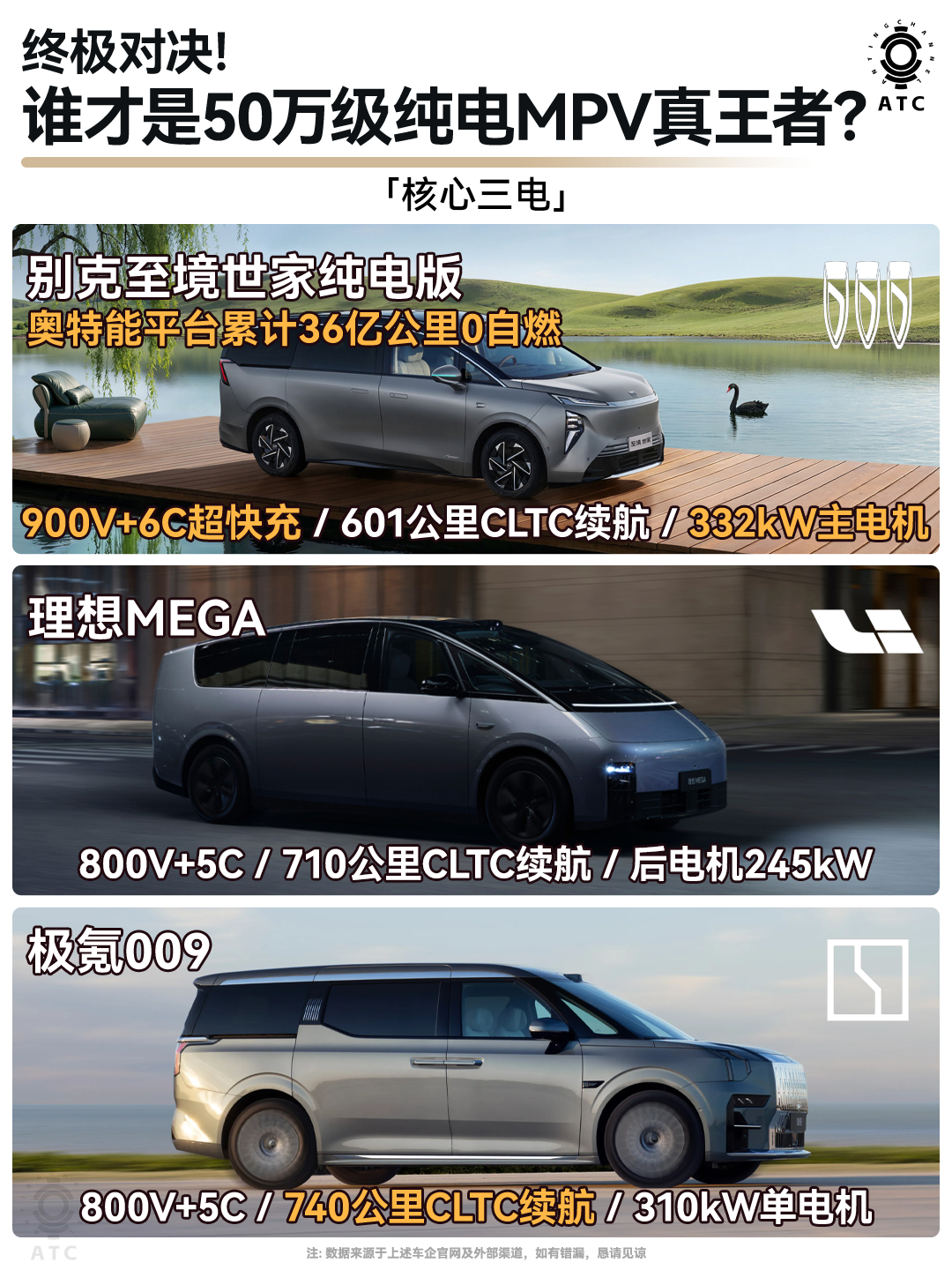 想换纯电MPV的宝子久等了,别克至境世家纯电版终于上市!目前限时上市权益至高能达8万2。没有高低配,不做选择题,所有产品体验都是满配!潜台词就是让用户拥有更好的体验。这气魄十足的发言,很别克~同时,我也懂大家决策上的慎重,所以把市面上热门的理想MEGA、极氪009抬上桌,做个细致对比,让宝子们买车换车更有的放矢~❶外观颜值别克至境世家纯电版:纯电版有专属“哑光灰”高定涂装,每平方米漆面嵌入60亿个纳米级消光粒子,豪华MPV市场量产哑光金属漆,高定涂装工艺,低调奢华。理想MEGA:水滴溜背,设计走简约未来风,适合喜欢科技感的人群。极氪009:隐藏式双A柱曲面玻璃+大尺寸静音风挡,优化了风阻与视野。❷空间尺寸别克至境世家纯电版:80%座舱得房率。二排双零重力座椅,三排空间富裕,家庭出行皆享受。理想MEGA:70.86%得房率,二排座椅舒适,三排电动大沙发。极氪009:没找到具体得房率,二排空间豪华,三排舒适有余。❸核心三电别克至境世家纯电版:搭载900V+6C。双电机四驱,332kW主电机。补能高效,动力强劲。奥特能平台累计36亿公里0自燃,保障安全。理想MEGA:800V+5C,充电10分钟补能500km,双电机四驱,后电机245kW。极氪009:也是800V+5C,单电机310kw,补能还可以。❹舒适配置别克至境世家纯电版:配备五恒大健康座舱,带来恒温、恒湿、恒氧、恒洁、恒静的健康舒适座舱环境。加上Nappa真皮座椅、Bose音响、8屏互动、-10°制冰模式,-6°~50°调节的冷暖箱,细节舒适拉满!理想MEGA:Nappa真皮座椅,双温区智能冷暖冰箱,铂金音响系统,出行便捷。极氪009:配备智能三防空气系统,Sofaro头等舱航空座椅+雅马哈音响,-6℃~50℃智能冷暖冰箱。个人很喜欢至境世家纯电版的综合质感,加上可圈可点的智能化和安全,真的值得推荐!目前限时权益也很香,尤其这个“金石之约”,真·行业首创,只要4999元,3年内单次车损≥购车价的30%,直接给你换新车!买断你三年的“事故车焦虑”,从此开车不必心惊胆战😭而且!特斯拉车主看过来👀置换或增购别克MPV,至高可享2万元补贴!这是什么神仙联动?MPV开创者致敬新能源开创者,排面拉满!