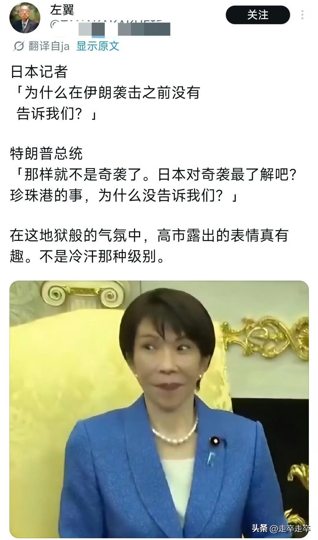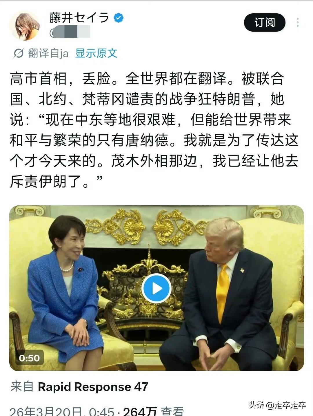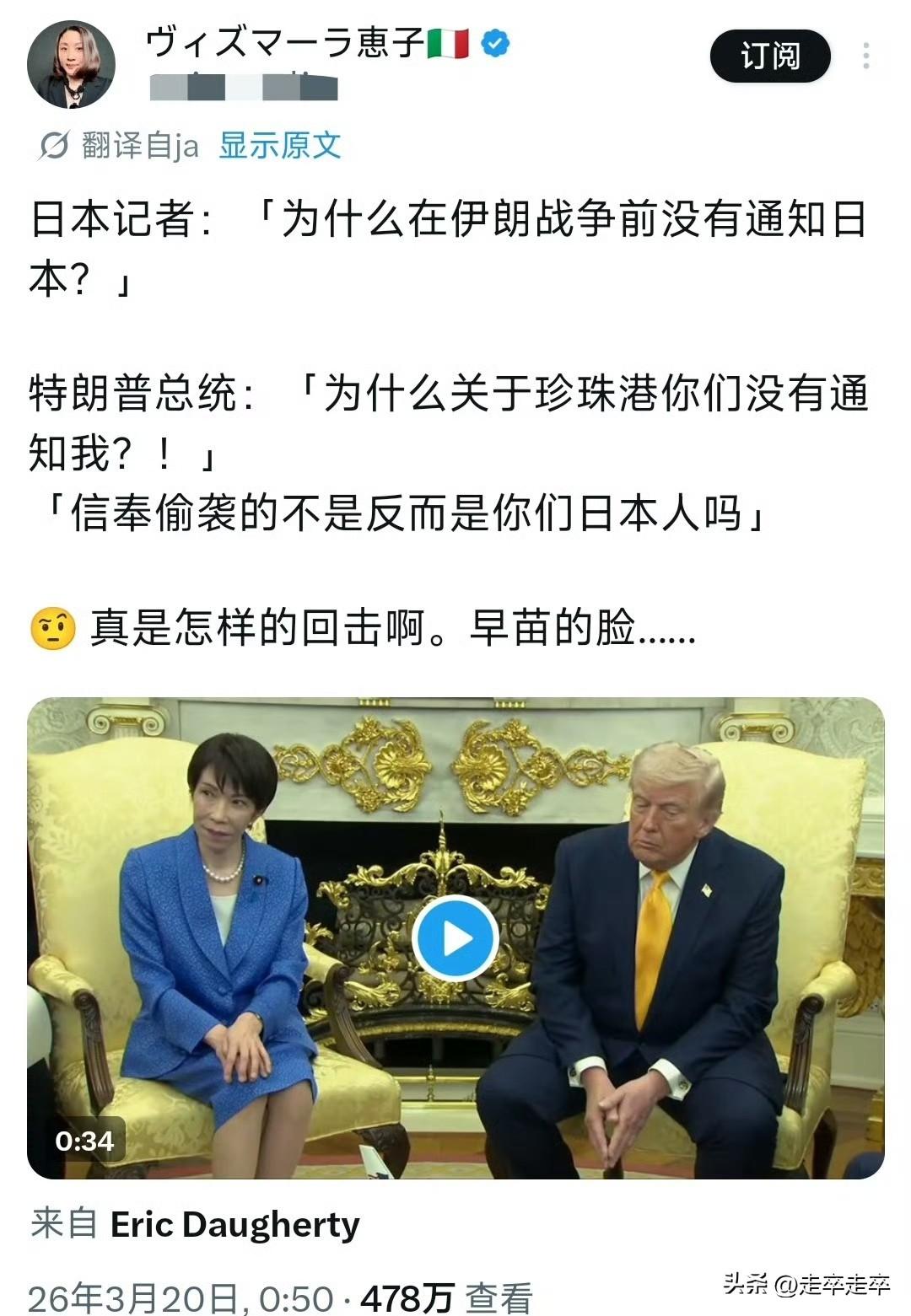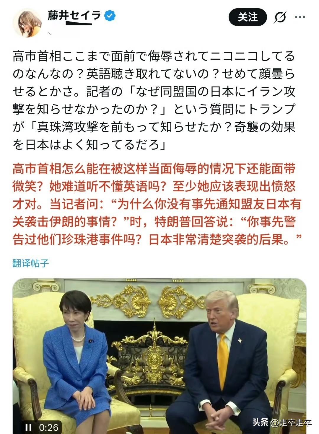 日本网民称高市早苗为“耻辱”😄 特朗普会见高市时提及珍珠港事件。当时日本记者,质问特朗普为何袭击伊朗前不通知日本,特朗普反呛:珍珠港事件你们通知我们了吗?日本最懂偷袭吧!高市当场露出的尴尬表情被日网嘲讽为日本的耻辱。😂 身为日本首相高市早苗,她未反驳特朗普言论,仅以微笑应对镜头。这个搞怪的表情被日本网友批评是为了“外交沦落为谄媚”。日本网民讽刺其“特朗普的走狗”“殖民地的顶尖人物”,认为她丢尽国家尊严。 日本网民不满高市早苗在国内强硬(炒作“存亡危机”),在美面前却卑微妥协。此前她在国内访美前被记者质问“为何不谴责美以”,仅回答“因为我要见特朗普了。而此次以特朗普会晤又献上5500亿美元投资却遭如此的羞辱,她只能在一旁强颜欢笑。珍珠港偷袭事件是日本二战最大污点、是美国国耻。特朗普当着日本首相面,拿日本黑历史给自己的军事行动洗地。等于直接在说,你日本才是偷袭鼻祖,你还有脸来问我 。 高市早苗本来是来“表忠心、求合作”的,结果被当众揭短、公开处刑,连一句反驳都不敢说,只能尬笑硬扛 。高市早苗一边对华强硬(在涉台谬论),一边在美面前扮“傻白甜”,说明了美日关系的主仆地位。高市早苗或许以为,用私人赞美能换取政治筹码,屠夫会因为牲口外表乖巧而放下屠刀🙄