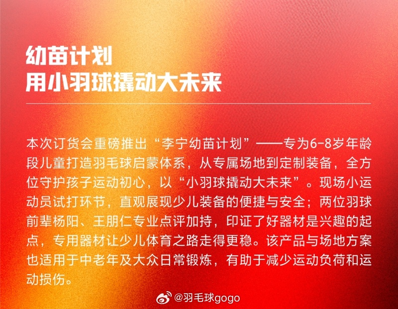 李宁计划推出全新的幼苗计划,包括推出专属于6至8岁的专属场地和定制装备