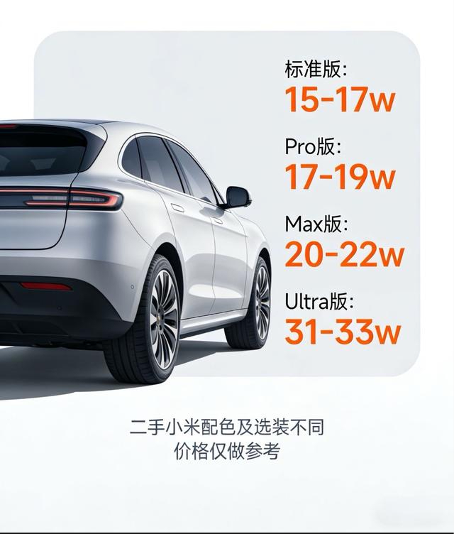 标准版15-17w,相比当初21.59w的新车起售价折价幅度已超20%,性价比开始凸显,适合预算有限又想尝鲜小米智驾生态的用户。 个人更推荐优先考虑Pro版,17-19w的区间和标准版差价并不悬殊,但续航和智能驾驶辅助体验明显上了一个台阶,日常通勤感知差异很大,多花这点值。 Max版20-22w目前折价还不够诱人,和新车价差偏小,建议再等半年,届时二手供给量上来后价格应该还有下探空间。 Ultra版31-33w我直接劝退——这个预算在二手市场不如等行情更成熟再入,或者直接考虑新款,现阶段溢价消化得还不充分。 总体判断:SU7二手流通量持续增加,价格重心仍在缓慢向下,近期不是最佳入手窗口,再观望一两个季度,性价比会更好。