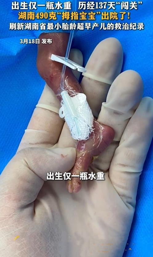 太不容易了!湖南这个宝宝出生才490克,比一瓶矿泉水还轻,如今终于健康出院了! 这事儿就发生在湖南,一个胎龄只有22+1周的小宝宝,一出生就刷新了当地最小胎龄超早产儿的救治纪录。刚来到世上时,他体重还不到500克,肺部根本没发育好,连自主呼吸都做不到。 但这小生命骨子里透着股倔劲儿!医护人员在黄金一小时里紧急给他做了气管插管,之后的137天里,用药精确到微克,还天天用温暖的袋鼠式护理陪着他,一起闯过了严重心律失常这些道道难关。 新生儿重症监护室里的叔叔阿姨们24小时守着他,还坚持给他写成长书信。出院那天,最后一封信悄悄塞进了他的襁褓里:“小小,是你治愈了我们。” 谁能想到,这么个小不点能扛过这么多难关?他凭着自己的意志力撑下来,医护人员又用专业和耐心一路守护,这哪是奇迹,分明是生命和爱的双向奔赴啊。 为这个了不起的宝宝点赞,也向所有守护生命的医护人员道声辛苦!来评论区送上你的祝福吧,转发出去,让更多人看到这份顽强的生命力~ 湖南490克拇指宝宝创造生命奇迹 信息来源:风芒新闻