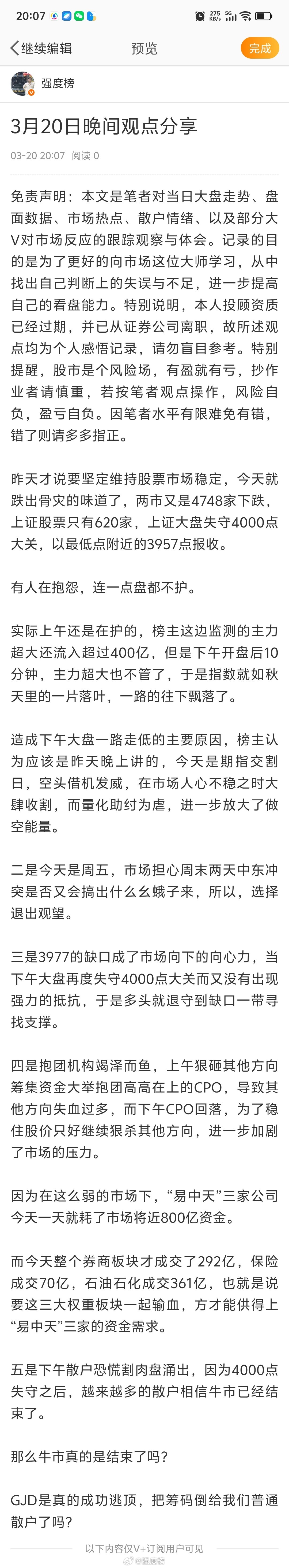 晚间分享股票A股 3月20日晚间观点分享今天A股市场走势不稳,两市又是近4800家股票下跌,上证大盘跌破4000大关,以接近当日最低点报收,目前市场对后市走法分歧极大,故今天V+部分内容公开,希望能给多头的朋友们一点鼓励与安慰。
