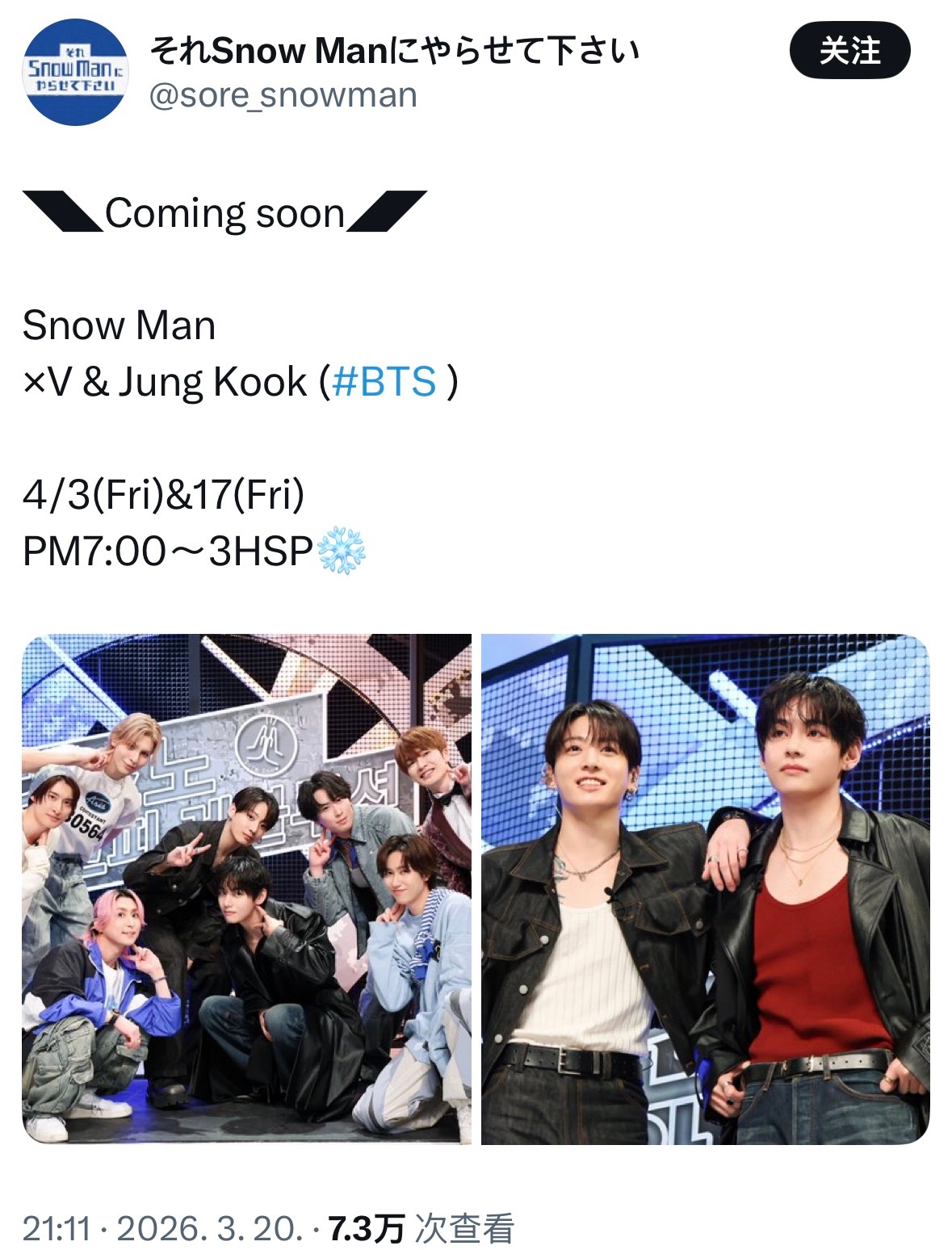 金泰亨田柾国将出演综艺金泰亨田柾国将一起出演综艺Snow Man x 防弹少年团金泰亨x田柾国 Coming soon!