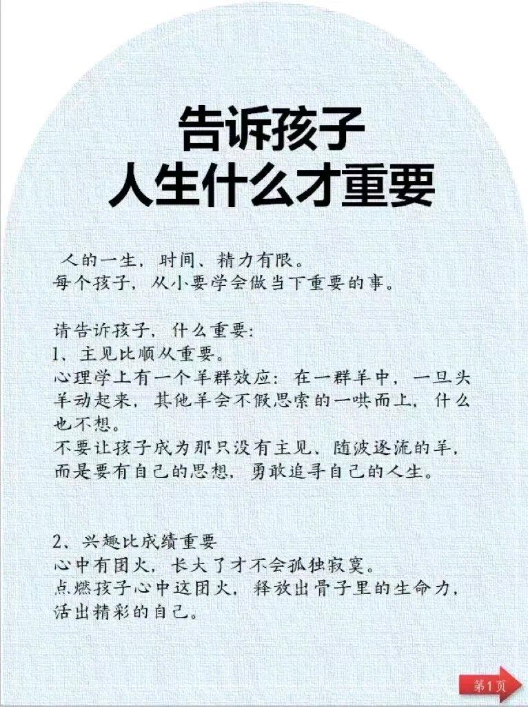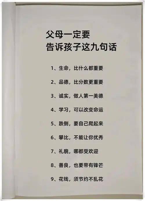 父母要告孩子哪些道理? 父母要告诫孩子的道理,往往不仅仅是生活的规矩,更是为他们未来的人生打下坚实基础的智慧。以下几条,是每个父母都希望孩子牢记的: 1.责任感是成长的基石 从小教孩子明白,责任不是负担,而是对自己和他人承诺的体现。无论是学习、家庭还是未来的工作,承担责任才能赢得信任和尊重。 2.诚实守信,做人最重要 诚实是立身之本,守信是立业之道。父母要让孩子懂得,谎言和欺骗可能暂时掩盖问题,但终将带来更大的麻烦和失信。 3.尊重他人,宽容待人 尊重是人际交往的润滑剂。教孩子学会理解和包容不同的观点和背景,才能建立良好的人际关系和团队精神。 4.努力比天赋更重要 天赋固然重要,但坚持不懈的努力才是成功的关键。父母应鼓励孩子面对困难不轻言放弃,学会用行动证明自己。 5.学会感恩,懂得回报 教育孩子感恩父母、师长和身边的人,懂得珍惜拥有的一切。感恩的心态能让人更积极、更幸福,也更愿意帮助他人。 6.独立思考,勇于表达 父母要鼓励孩子有自己的见解,不盲从,不随波逐流。学会理性思考和表达,是成长为有主见、有担当的成年人的重要一步。 7.健康是最大的财富 身体是革命的本钱。教孩子养成良好的生活习惯,重视锻炼和饮食,才能有充沛的精力去追求梦想。 8.学会管理时间和情绪 时间公平而宝贵,情绪影响决策。父母应引导孩子合理安排时间,控制情绪,保持积极心态,才能高效且快乐地生活。 这些道理,看似简单,却是孩子成长路上最珍贵的指南。父母的每一句教诲,都是为孩子铺设通往未来的桥梁。只有真正理解并践行这些道理,孩子才能在人生的舞台上自信从容,走得更远更稳。家长先告诉孩子 父母必嘱咐的话 小孩应知道的道理