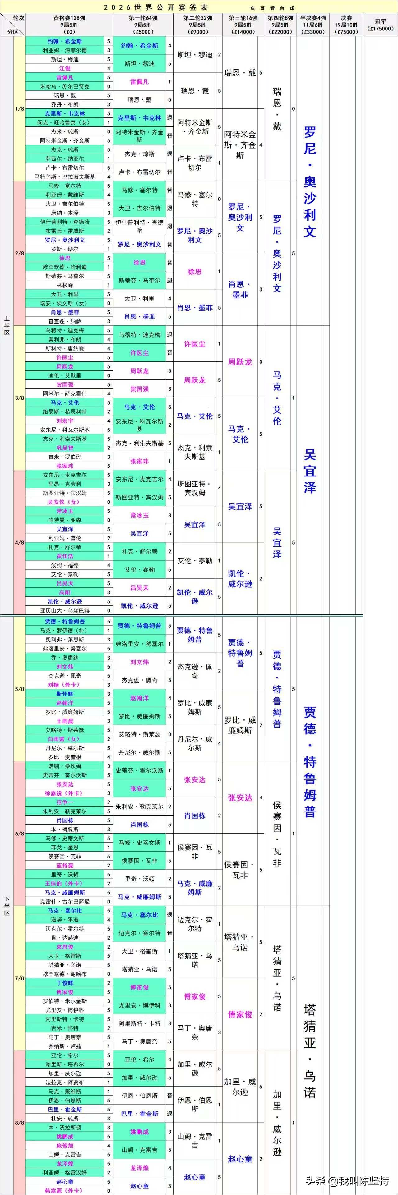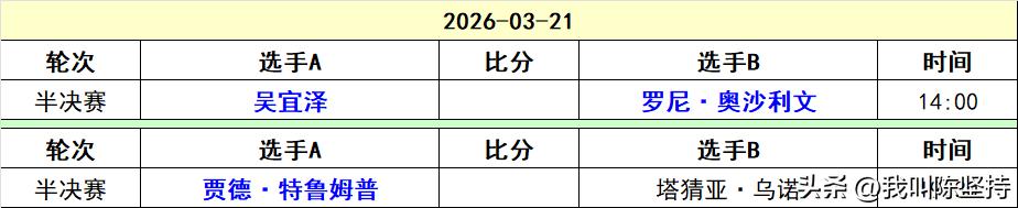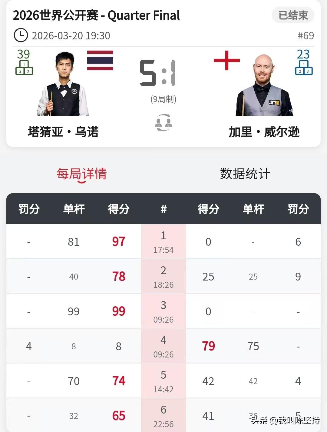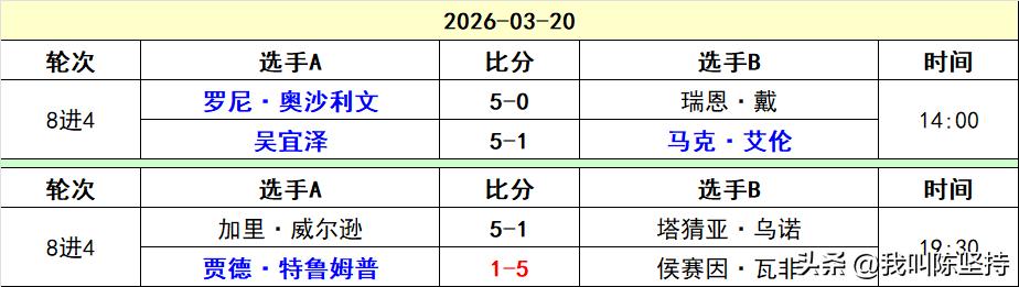 加里威尔逊雄风不再1-5被塔猜亚淘汰,特鲁姆普保持世界第一的实力5-1淘汰伊朗名将瓦菲。 昨天加里威尔逊特别生猛,打出3杆过百,战胜赵心童进入8强。今天碰到球风和赵心童一样,同为四大莽夫之一的塔猜亚却磕磕碰碰。塔猜亚准度高,关键球失误比赵心童少,最终战胜加里威尔逊进入4强,对于塔猜亚来说,是难得的好成绩。以至于这次来玉山的衣服不够穿了,每天在酒店洗衣服。 特鲁姆普一如既往的稳定,就算状态一般,也能拿捏。5-1战胜颇具实力的瓦菲。 对于肖国栋来说,成功保住了巡回锦标赛的资格,参赛就有两万英镑的奖金。他排名第13,由于奥沙利文退赛,肖国栋成功入围。 丁俊晖保住了前16,世锦赛不用打资格赛,直接打正赛。 明天下午两点,吴宜泽对阵奥沙利文,火星撞地球。 晚上七点半,特鲁姆普对阵塔猜亚,特鲁姆普占优。