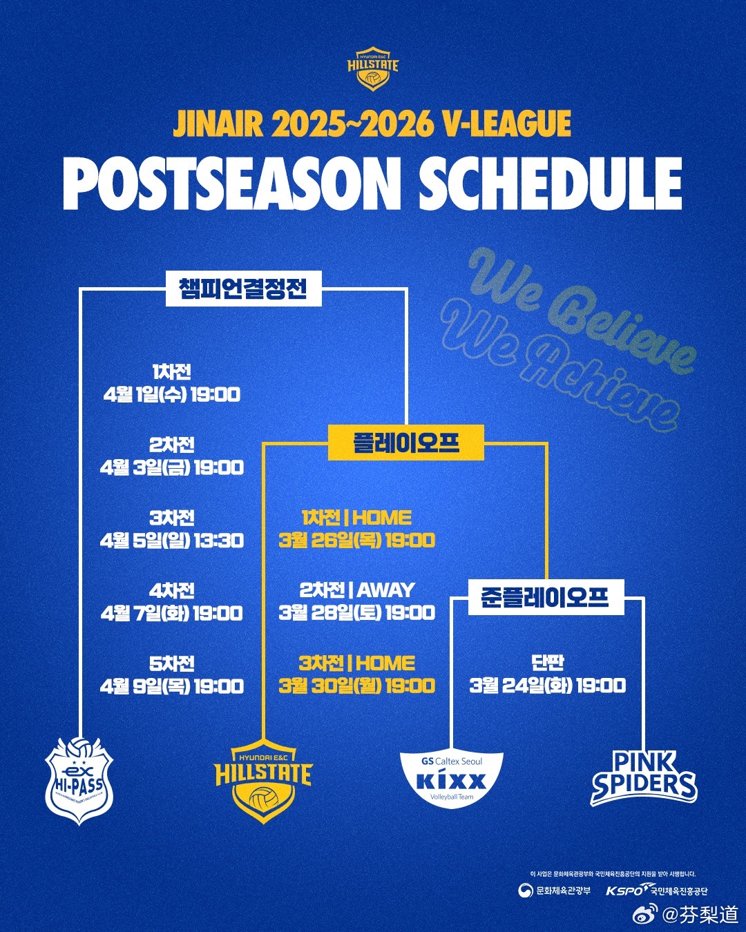 3月26日18:00 现代建设 vs 附加赛胜者 水原体育馆 半决赛第一场3月28日18:00 附加赛胜者 vs 现代建设 待定 半决赛第二场3月30日18:00 现代建设 vs 附加赛胜者 水原体育馆 半决赛第三场