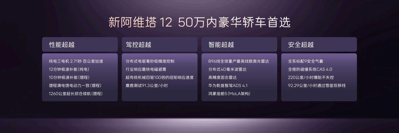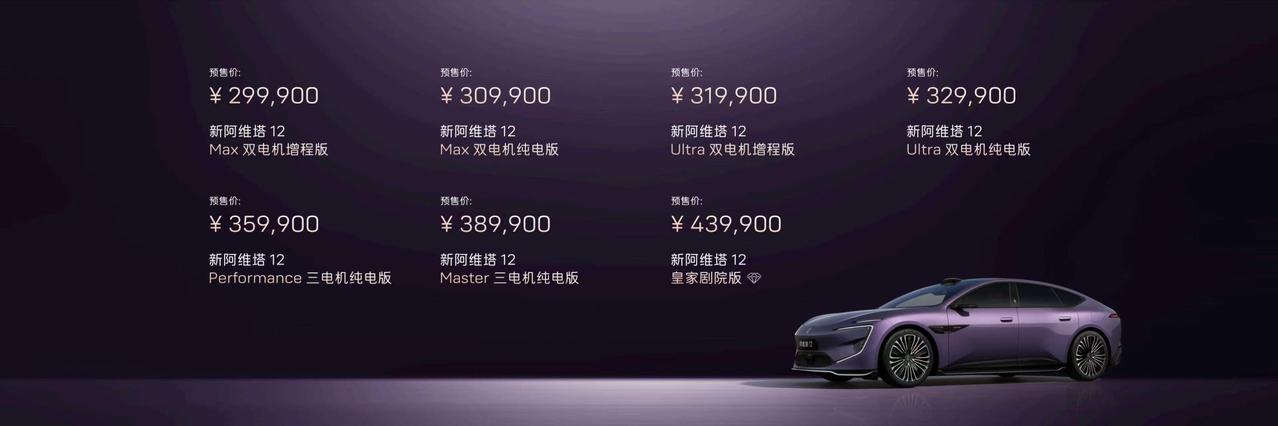 车盟快讯:今晚,新阿维塔12预售,预售价区间为29.99万-43.99万元,预售政策诚意拉满:下订享2000 元意向金抵 5000 元定金,首任车主享终身三电质保,更有 1 万元定金膨胀、2 万元 ADS 高阶功能包抵扣券等多重礼遇,新车提供增程与纯电双动力选择,搭载华为896线图像级激光雷达与太行智控2.0,智驾能力全面升级;增程版纯电续航 350km,纯电版最高续航 735km,兼顾性能与实用性,所以各位看阿维塔为全新12喊出的口号