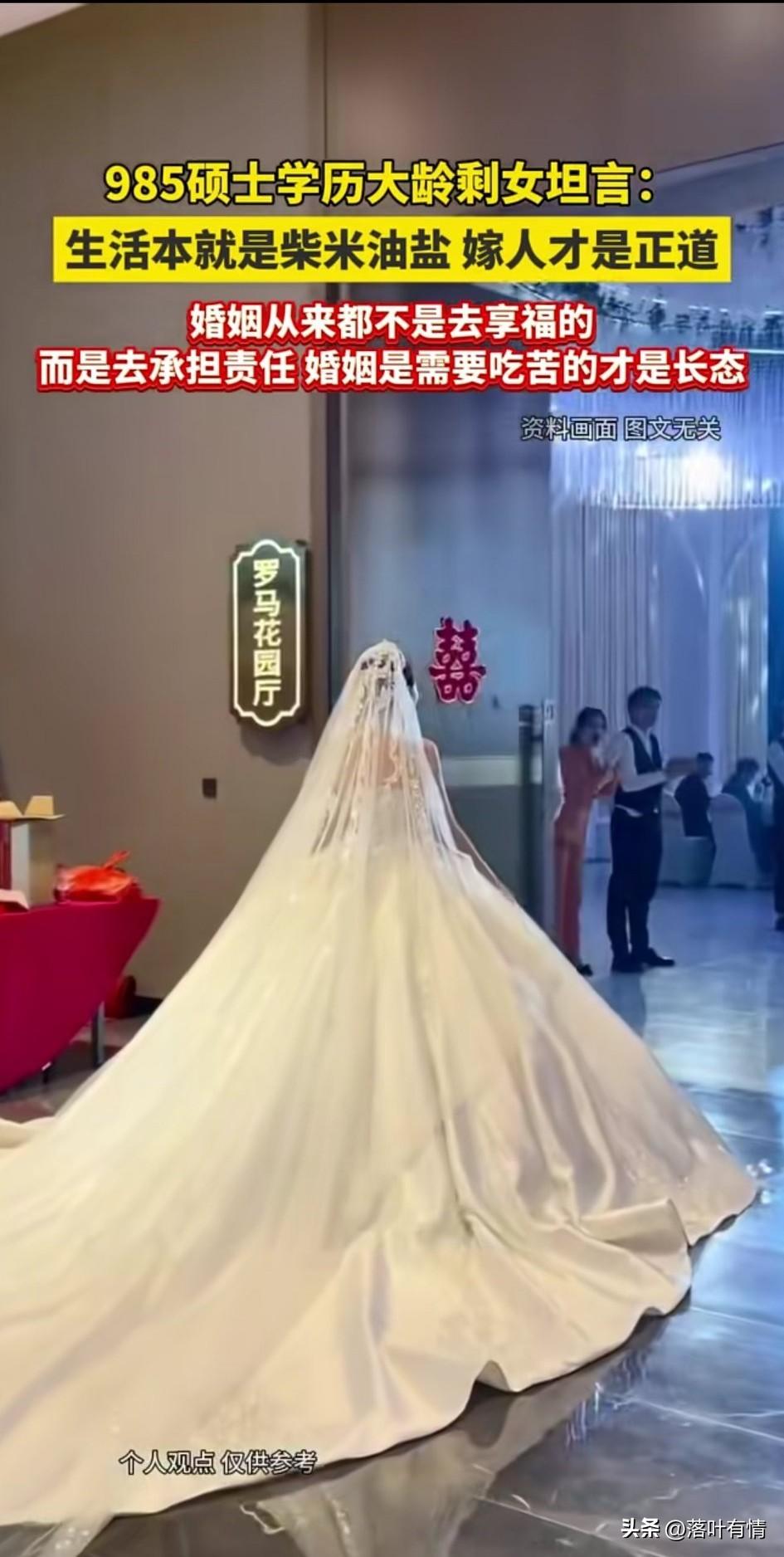 一位985的大龄剩女, 今年38了还没有嫁出去, 马上要奔四的年纪了, 她彻底的慌了, 这个时候也彻底顿悟了, 她觉得她应该改掉脾气, 不要好高骛远, 不要抱有不切实际的爱情幻想, 嫁人才是正道, 生活本来就是柴米油盐, 生活就是普普通通, 我们应该意识到婚姻它从来不是去享受的,而是去承担责任的, 所有的婚姻都是去承担责任的, 所以婚姻都是吃苦的,这才是常态! 如今38岁的她才想通, 大家觉得她是真的要改了吗? 这样的人娶到之后会幸福吗? 会不会又是一地鸡毛, 大家觉得大龄单身女能娶吗? 大龄女孩择偶 婚姻大龄剩女 大龄女择偶观 大龄未婚情感 大龄女婚恋观