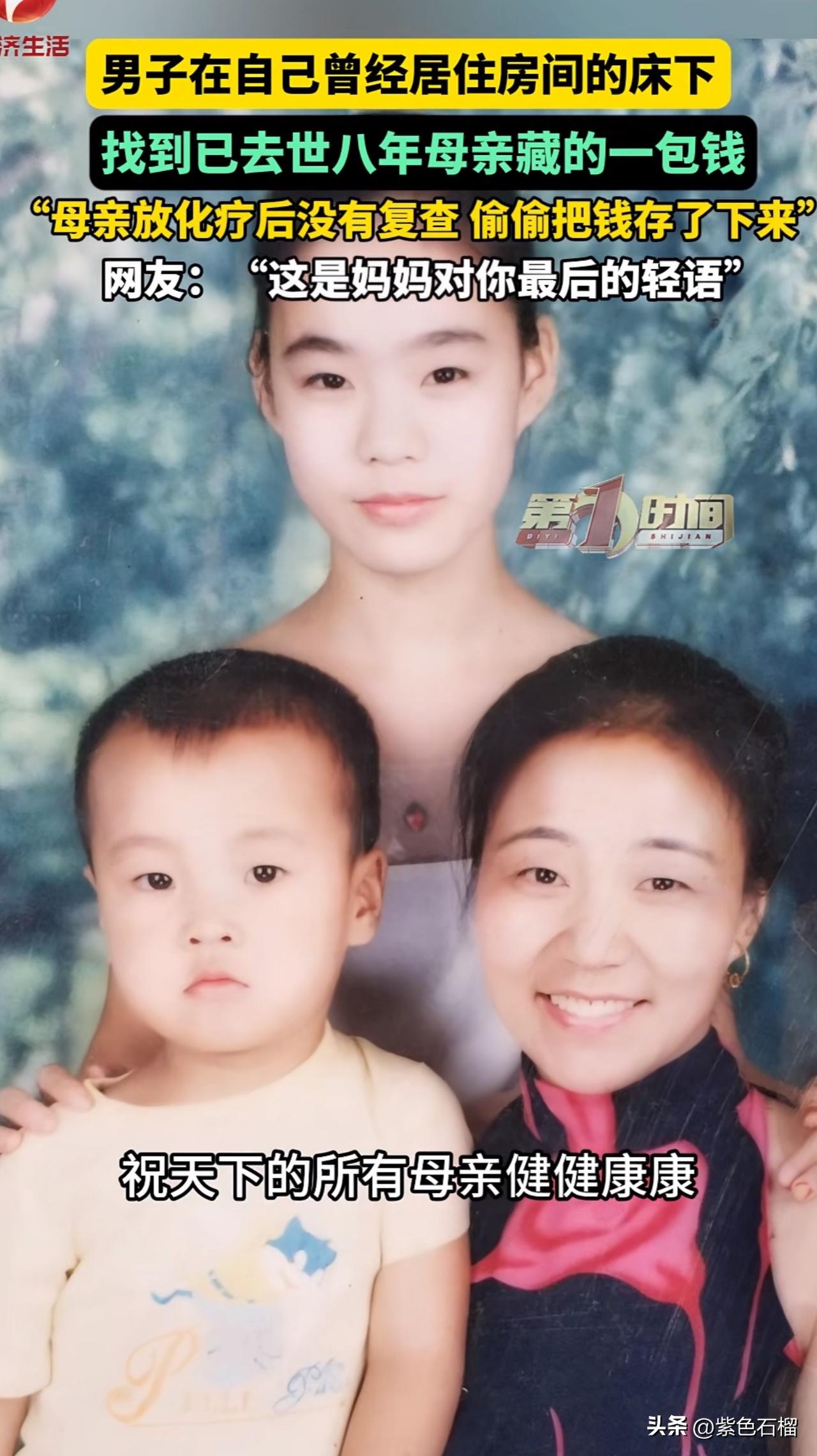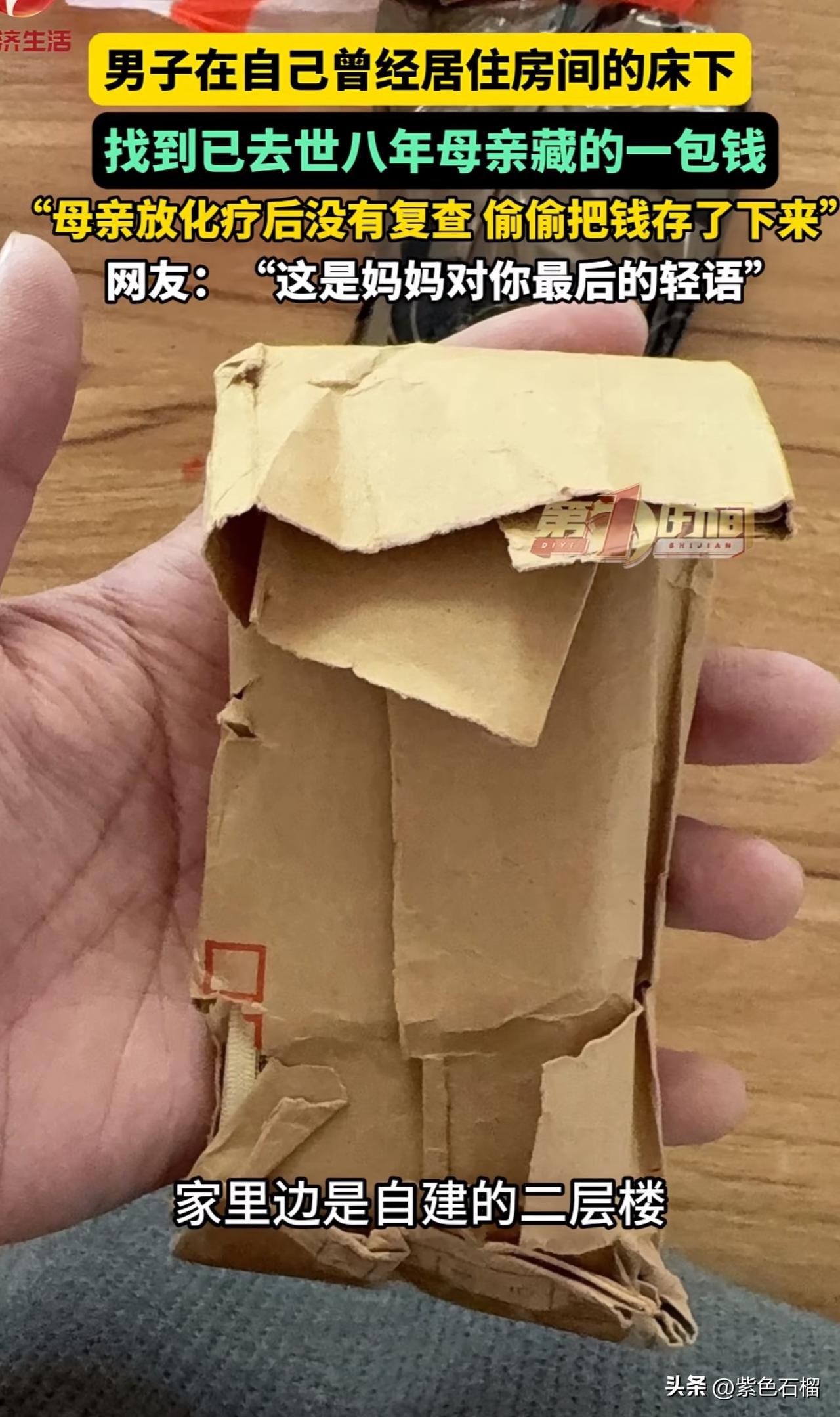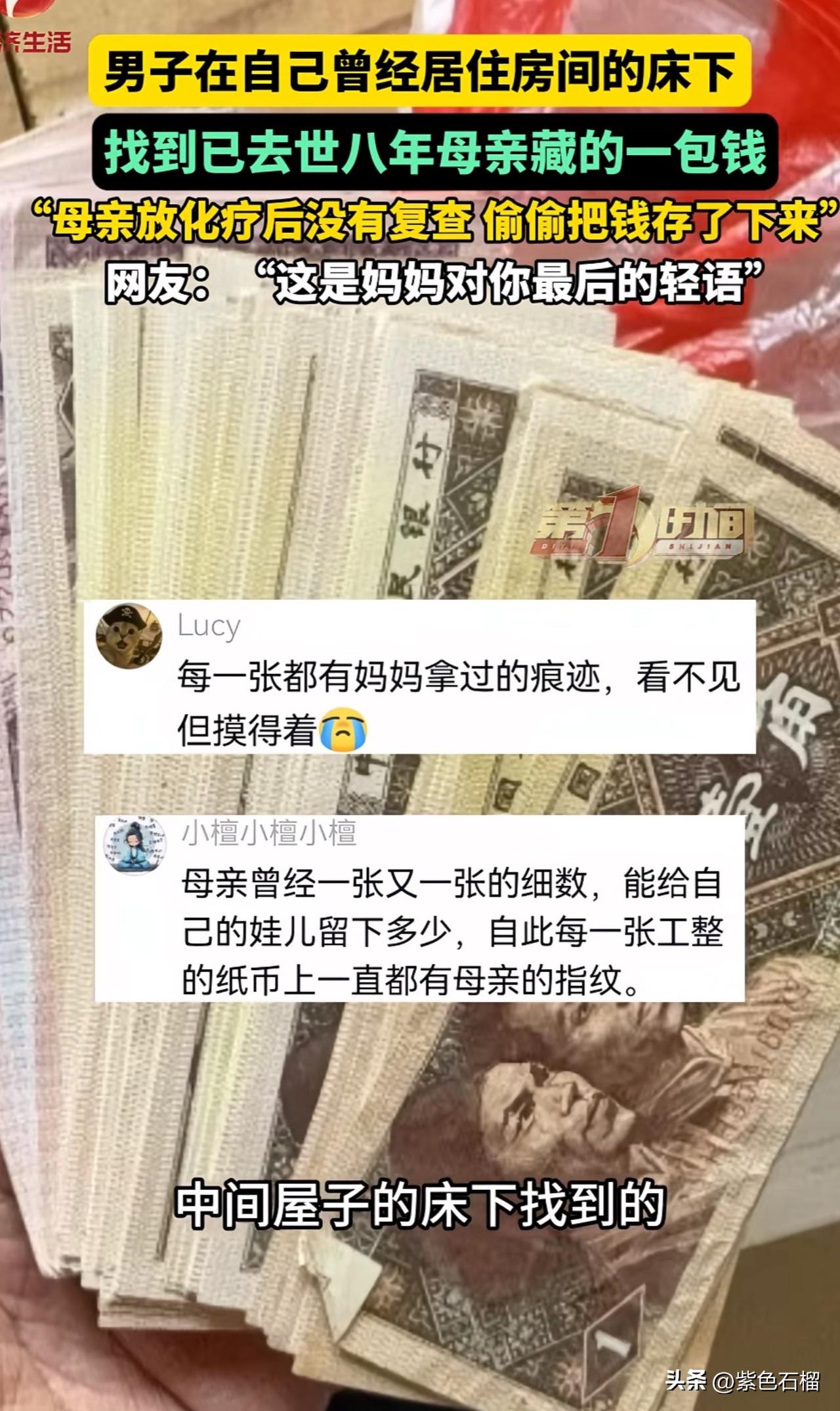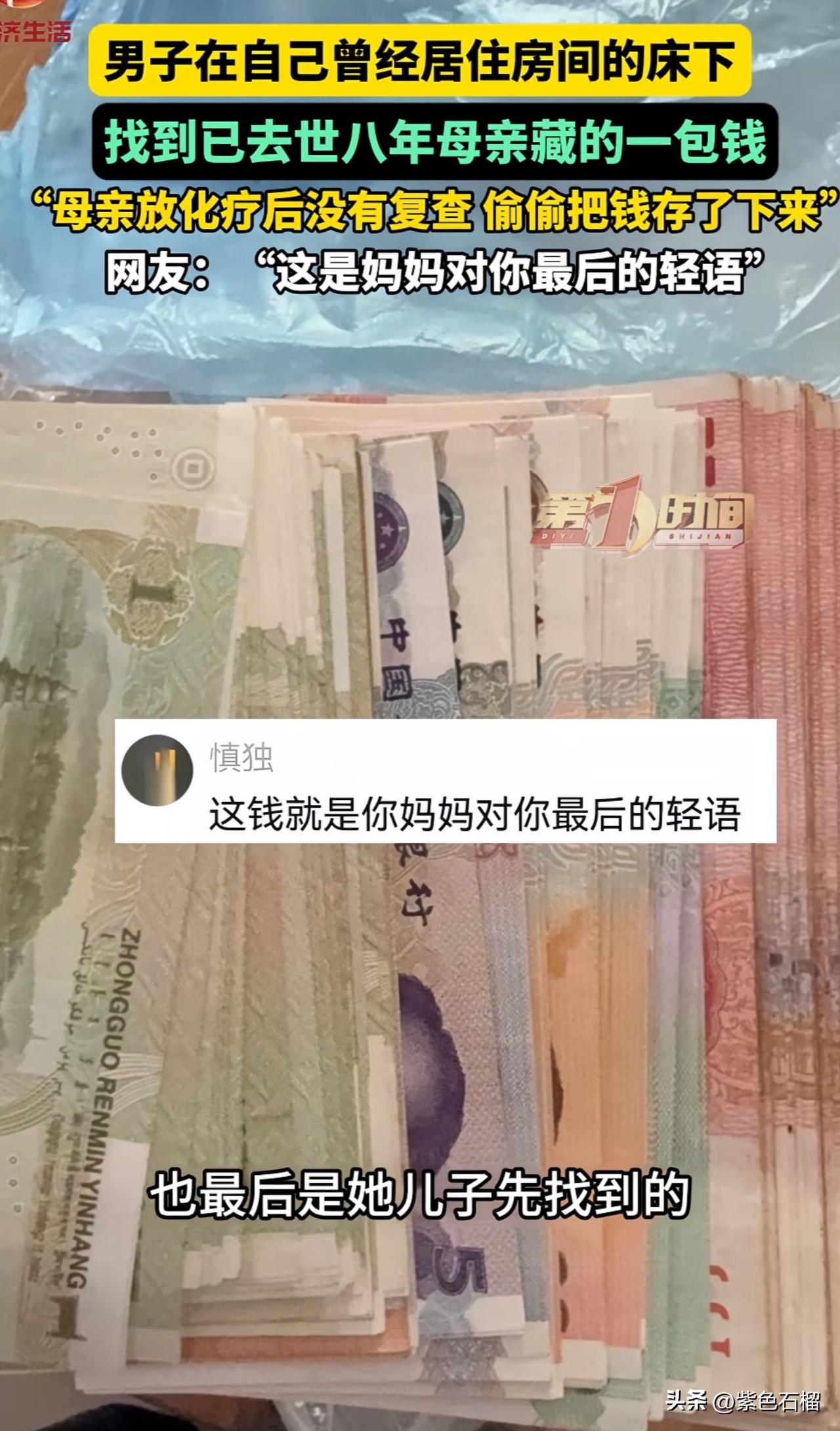 泪目!河南一名男子打扫房间时,竟发现一包去世八年的母亲偷偷藏下的钱。 八年前,男子的母亲身患重病,需接受放化疗。然而,母亲每次化疗后都不复查,悄悄把钱省了下来。 男子打开钱包,只见里面的钱被母亲叠得方方正正。有一元面值的,有十元面值的,还有50元和100元面值的,甚至还有很多一毛的。想到每张钱上都曾留存母亲的体温,男子再也抑制不住哭出了声。 对此,有网友感慨:“这就是妈妈的爱啊,自己有病都舍不得花,看得我眼泪直流。” 还有网友说:“妈妈虽然走了,但那份牵挂始终都在。” 母爱,着实是世界上最伟大的存在。她总是把最好的东西留给自己的孩子。愿世上所有的妈妈都能健康长寿!