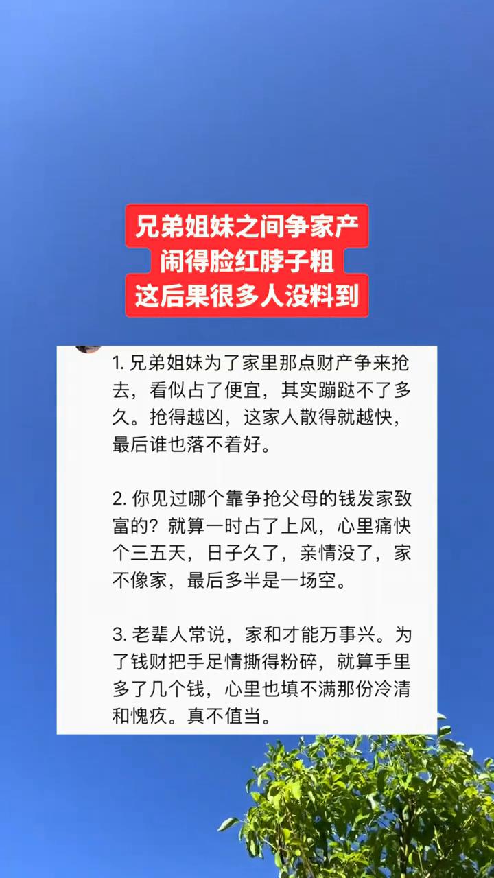 兄弟姐妹之间争家产闹得脸红脖子粗,这后果很多人没料到。 ·1.兄弟姐妹为了家里那点财产争来抢去,看似占了便宜,其实蹦跶不了多久。抢得越凶,这家人散得就越快,最后谁也落不着好。 ·2.你见过哪个靠争抢父母的钱发家致富的?就算一时占了上风,心里痛快个三五天,日子久了,亲情没了,家不像家,最后多半是一场空。 ·3.老辈人常说,家和才能万事兴。为了钱财把手足情撕得粉碎,就算手里多了几个钱,心里也填不满那份冷清和愧疚。真不值当。