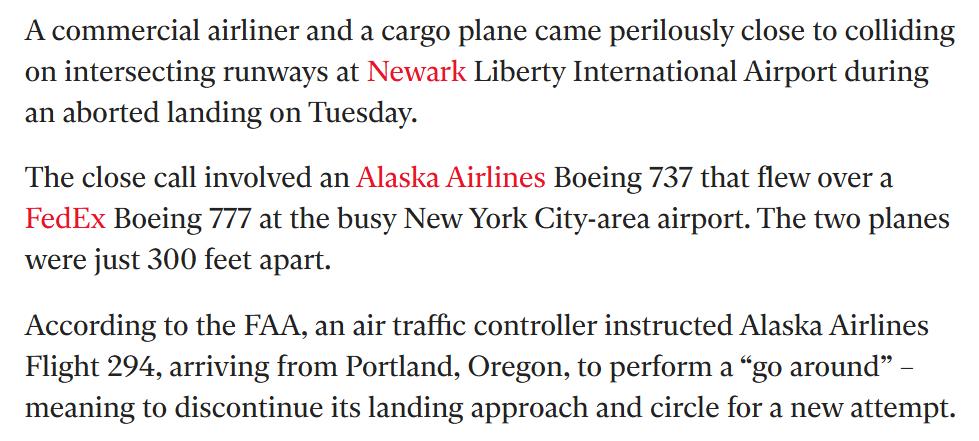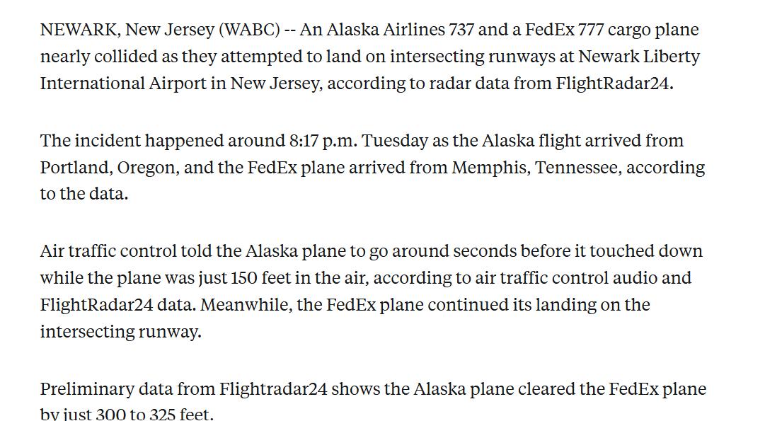 纽瓦克机场惊魂一幕 两机险相撞 2026年3月17日晚,美国纽瓦克机场发生惊险一幕: 阿拉斯加航空737 MAX客机与联邦快递777货机使用交叉跑道进近时险些相撞。 客机降至150英尺低空即将接地,管制员才紧急下令复飞,两机最近垂直距离仅90米,所幸无人员伤亡及飞机损坏。 FAA与NTSB已介入,初步判定为空管指挥及间隔判断失误。 美国大量老旧枢纽机场受城市空间、改造成本限制,无法改为更安全的平行跑道,只能依靠交叉跑道保障起降效率,维持民航系统运转。 美国长期以“可接受风险换运行效率”,但这套模式高度依赖稳定可靠的空管保障。如今接连出现险情,说明其安全基础正在松动。