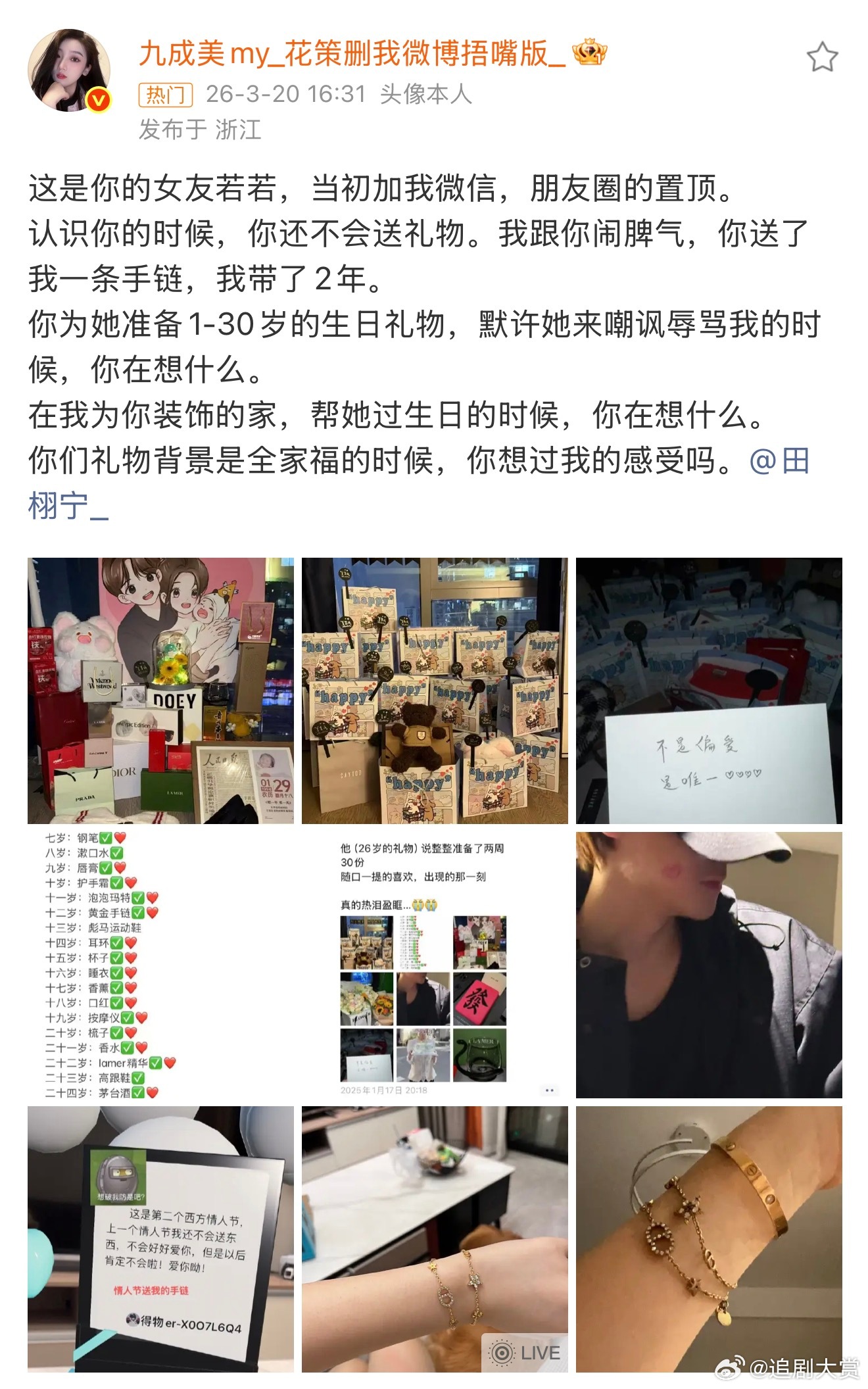 九成美回复田栩宁粉丝在九成美发了若若朋友圈之后,有田栩宁粉丝出来反驳,随后九成美