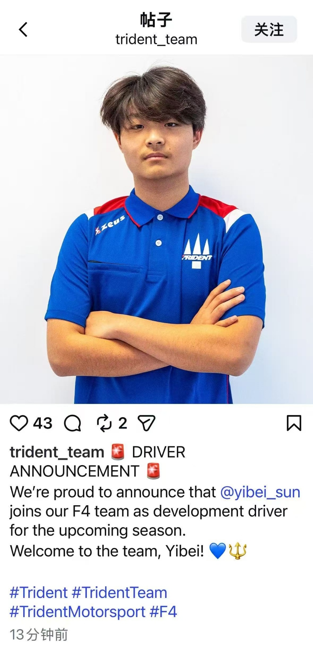 孙一北加入Trident车队欧洲F4再添中国力量!孙一北签约Trident车队,正式开启海外征程。年轻无畏,勇往直前,期待他在国际赛道上驰骋,展现中国车手的风采,一路披荆斩棘!