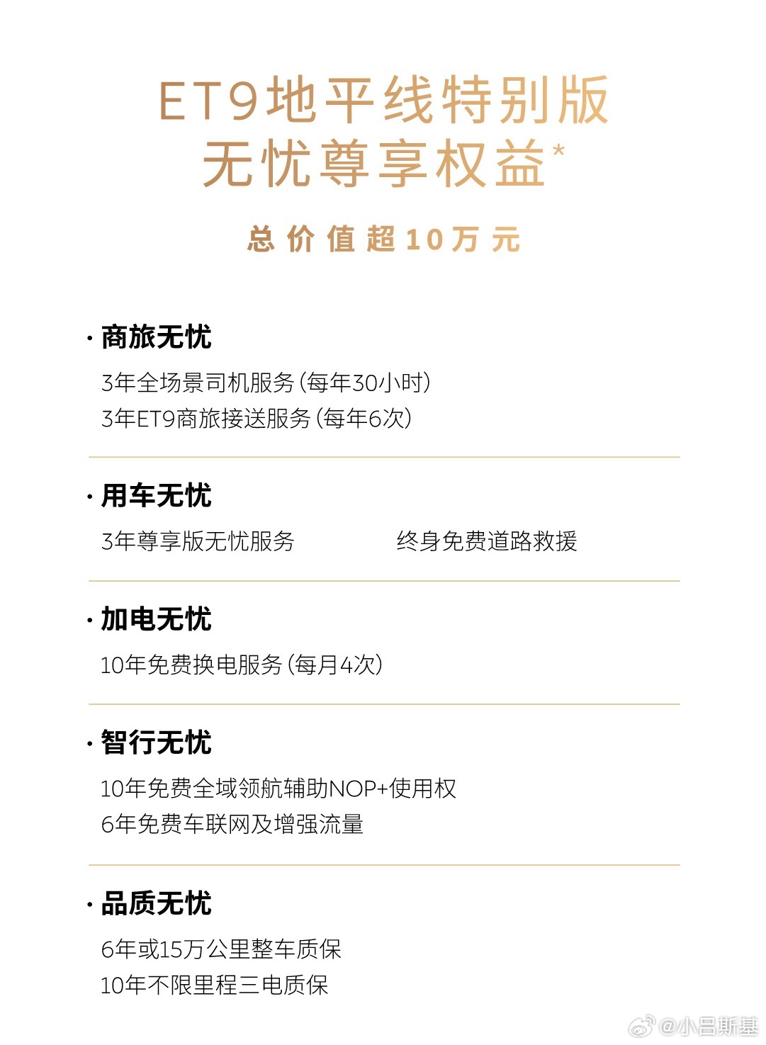 当然除了车,我看“商旅无忧、用车无忧、加电无忧、智行无忧和品质无忧”这几个权益挺显尊贵。作为蔚来品牌入门车型ET5T的车主,我也想要 蔚来ET9地平线特别版上市