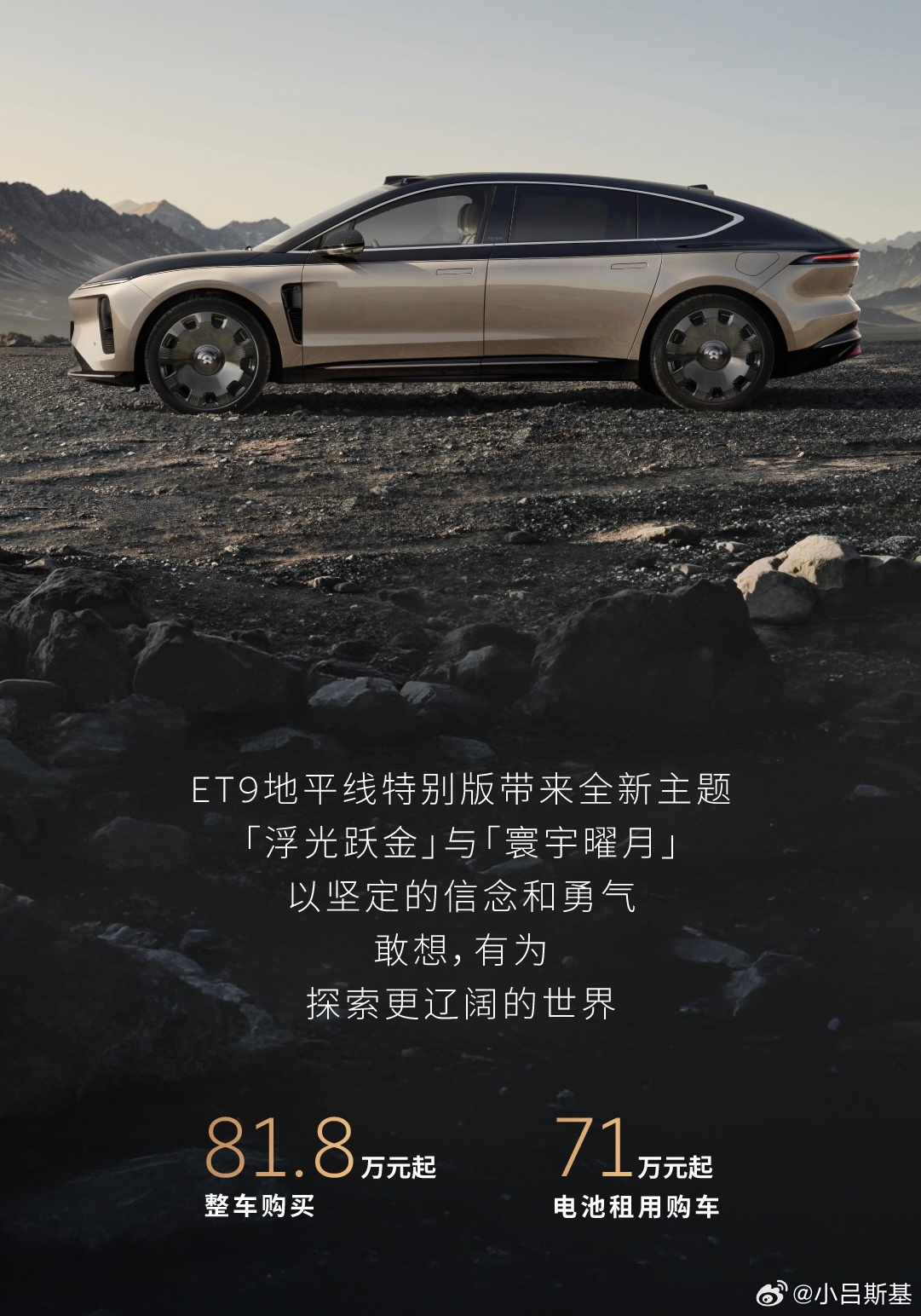 今天,蔚来ET9地平线特别版上市,整车购买81.8万元起,电池租用购车71万元起。新车将采用浮光跃金和寰宇曜月双拼配色,限量199台。路上回头率肯定差不了。