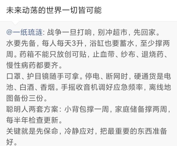 刷到一段很扎心的话:战争一旦打响,别冲超市先回家,储水备药,备好应急物资,冷静保命。 底下有人附和:动荡的世界,一切皆有可能。 这话听着没毛病,甚至很清醒。 居安思危没错,有备无患也没错,家里备点水、药、应急包,应对地震、洪水、突发停水电,本就是成年人该有的常识。 但很多人看着看着,就把“一切皆有可能”理解成了“马上就要发生”,把忧患意识,活成了深度焦虑。 世界不太平是事实,局部冲突、地缘博弈、经济波动,每天都在上演,谁也没法拍胸脯说绝对不会有意外。 可“有可能”不等于“必然来”,更不等于“现在就来”。 真正成熟的态度,是两手都要抓: 一边承认风险存在,适当储备,不打无准备之仗; 一边相信国家底气,不被焦虑裹挟,不盲目恐慌囤货。 别忘了,在这个动荡的世界里,我们脚下这片土地,已经安稳了很多年。 完整的工业体系、充足的粮食储备、强大的国防力量、高效的社会治理,才是我们对抗未知风险的最大底气。 对于咱们普通人来说,可以有危机感,但千万别被危机感吞噬。 做好该做的准备,过好当下的日子,不信谣、不恐慌、不内耗。 未来世界或许充满不确定,但我们的安稳,从来都有坚实依靠。