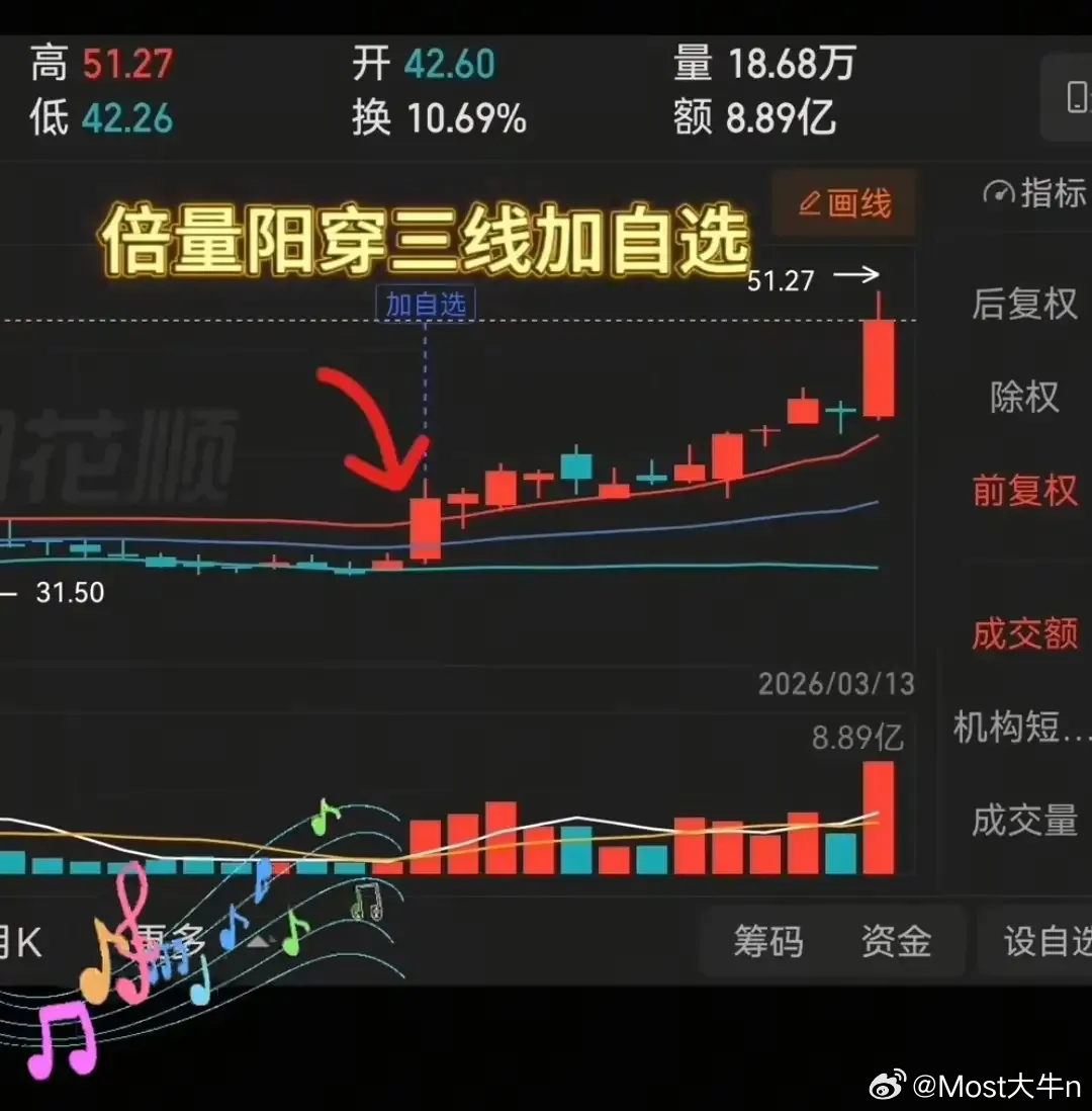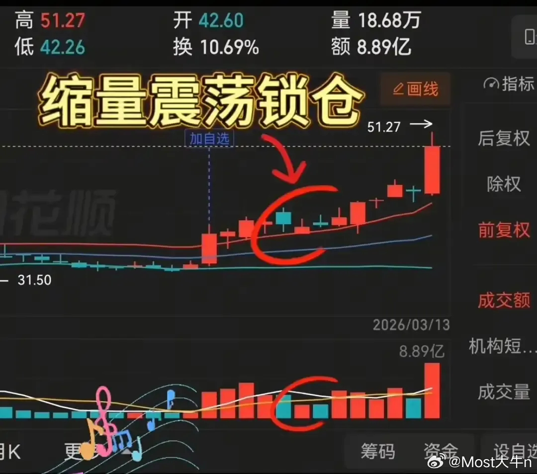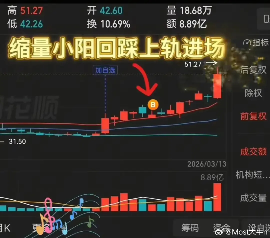 1. 倍量阳穿三线:低位横盘后,放量(倍量)阳线同时突破布林带中轨、5/10日线,主力进场信号,加入自选观察。2. 温和放量吸筹:倍量阳后,小阳/十字星缓涨,量能维持,沿布林中轨上行,主力洗浮筹,确认无出逃。3. 缩量洗盘锁仓:股价小阴回落,量能骤减,布林中轨上方窄震,抛压枯竭,洗盘近尾声。4. 缩量小阳回踩上轨:洗盘末,缩量小阳回踩布林上轨,支撑有效+筹码稳,果断入场,抓主升浪。
