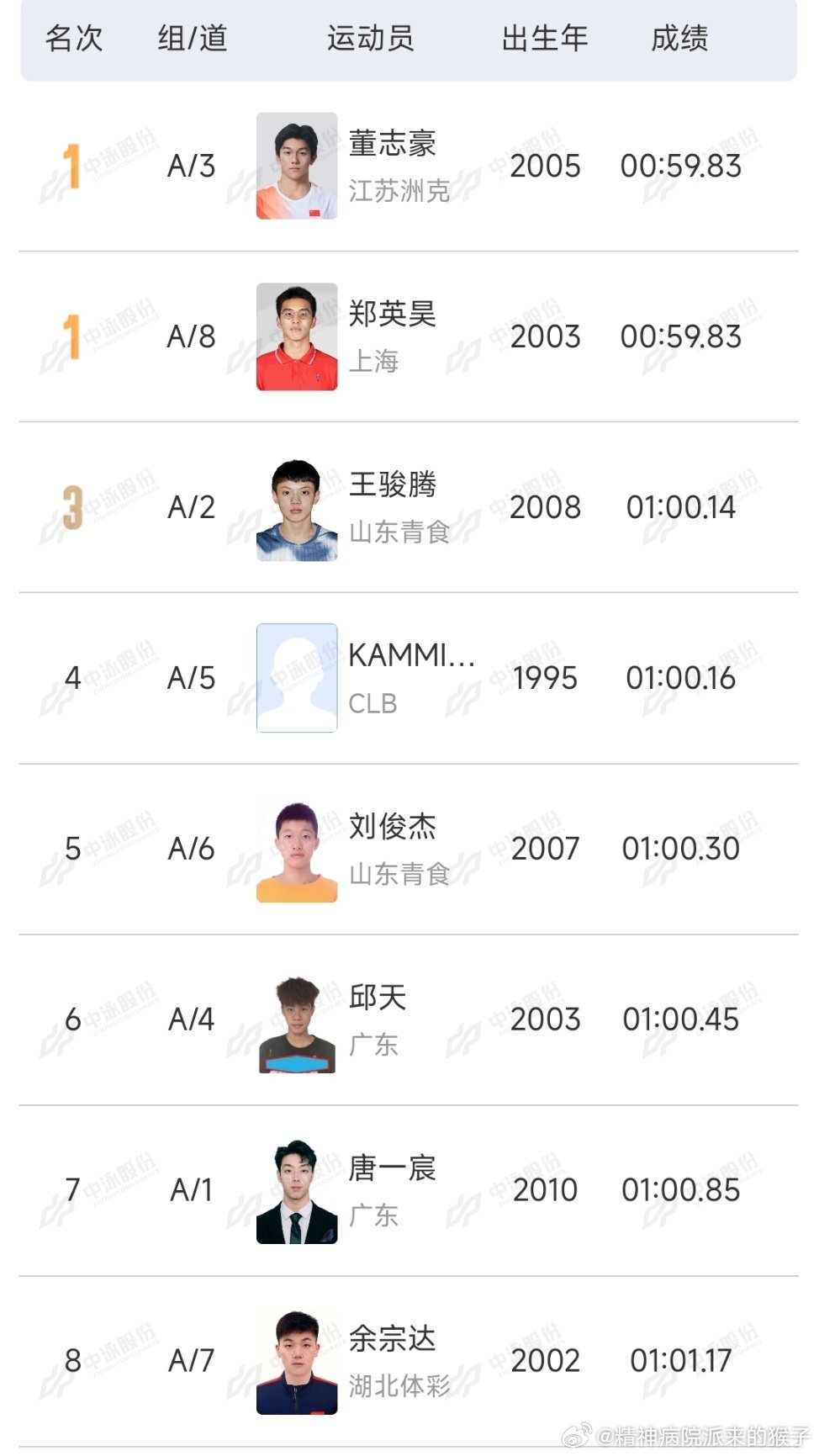 2026年中国游泳公开赛 男子100米蛙泳决赛:董志豪与郑英昊59.83并列获得冠军🥇一人奖金1万刀😂王骏腾1:00.14获得季军🥉